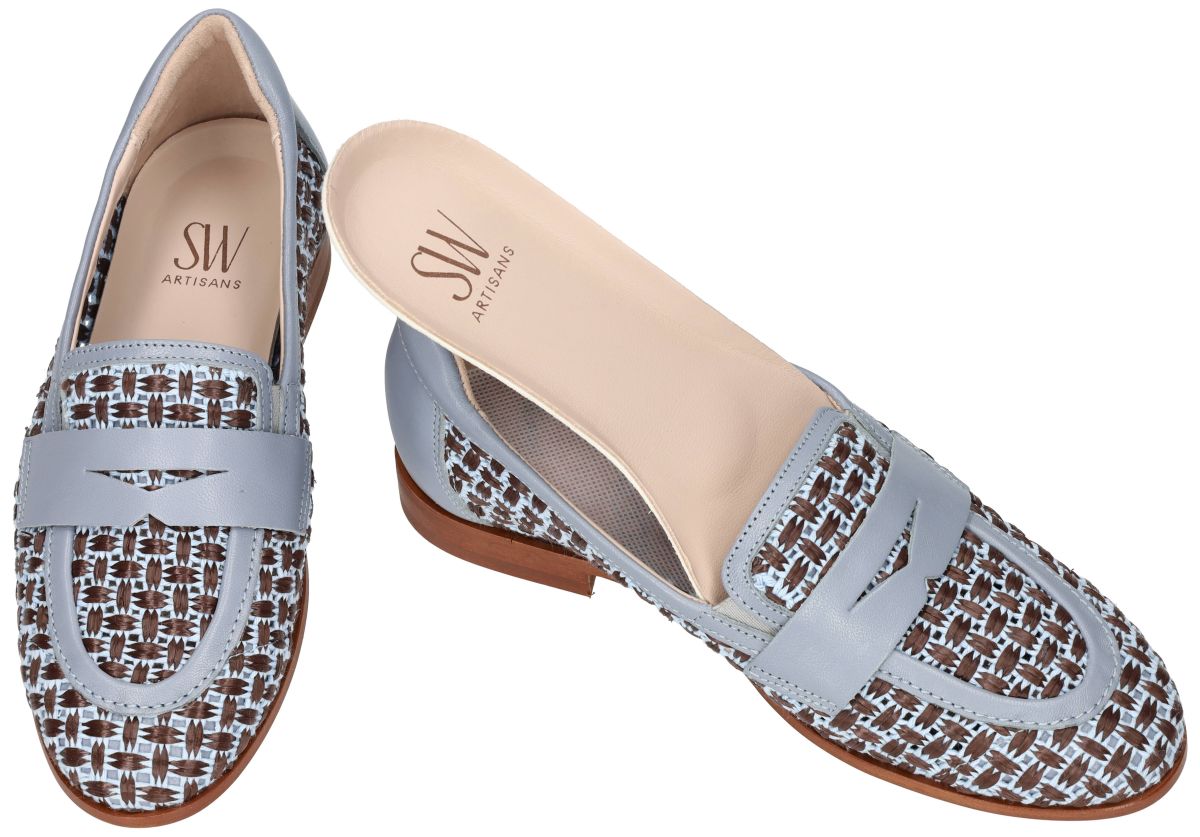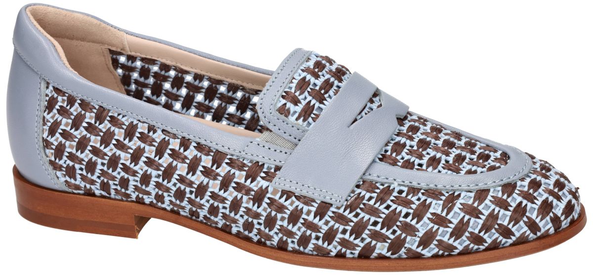 Deze Softwaves SINA pennyloafer voor dames, style 9.10.11 in de kleurstelling fond/cielo/deni, is een elegante en eigentijdse interpretatie van de klassieke loafer uit de nieuwe lente/zomercollectie van het Portugese schoenenmerk Softwaves. Dit model combineert ambachtelijk vakmanschap, verfijnde materialen en een uitgesproken modieuze uitstraling. Deze loafer is een waarachtige blikvanger dankzij de ongeziene kleurencombinatie van fond (warm bruin), cielo (lichtblauw) en deni (blauwgrijs). De unieke upper bestaat uit een kunstzinnig geweven tressé of vlechtwerk structuur die zorgt voor een rijke textuur en een luchtig, zomers karakter. De geweven delen worden elegant omlijst door zacht, glad leder in een lichtblauwe tint, wat het geheel een bijzonder verfijnde en luxueuze afwerking geeft. De klassieke pennystrap op de wreef benadrukt het tijdloze loaferdesign, terwijl de moderne materiaalkeuze en kleurencombinatie deze schoen een hedendaagse, high-fashion uitstraling geven. De slanke leest en zuivere lijnen maken dit model moeiteloos combineerbaar met zowel casual-chique outfits als meer geklede zomerse looks. Aan de binnenzijde is de SINA afgewerkt met een zachte lederen binnenvoering, wat zorgt voor een aangenaam draaggevoel en een optimaal voetklimaat. De lage hak in warme houttint versterkt het elegante karakter en biedt tegelijk stabiliteit voor dagelijks gebruik. De subtiele elastische inzet aan de wreef vergemakkelijkt het aantrekken en verhoogt het comfort. De nieuwste collectie Softwaves schoenen vindt men in onze winkel regio Aalst, Ninove, Geraardsbergen, Zottegem, Liedekerke of kan men online shoppen in onze webshop.