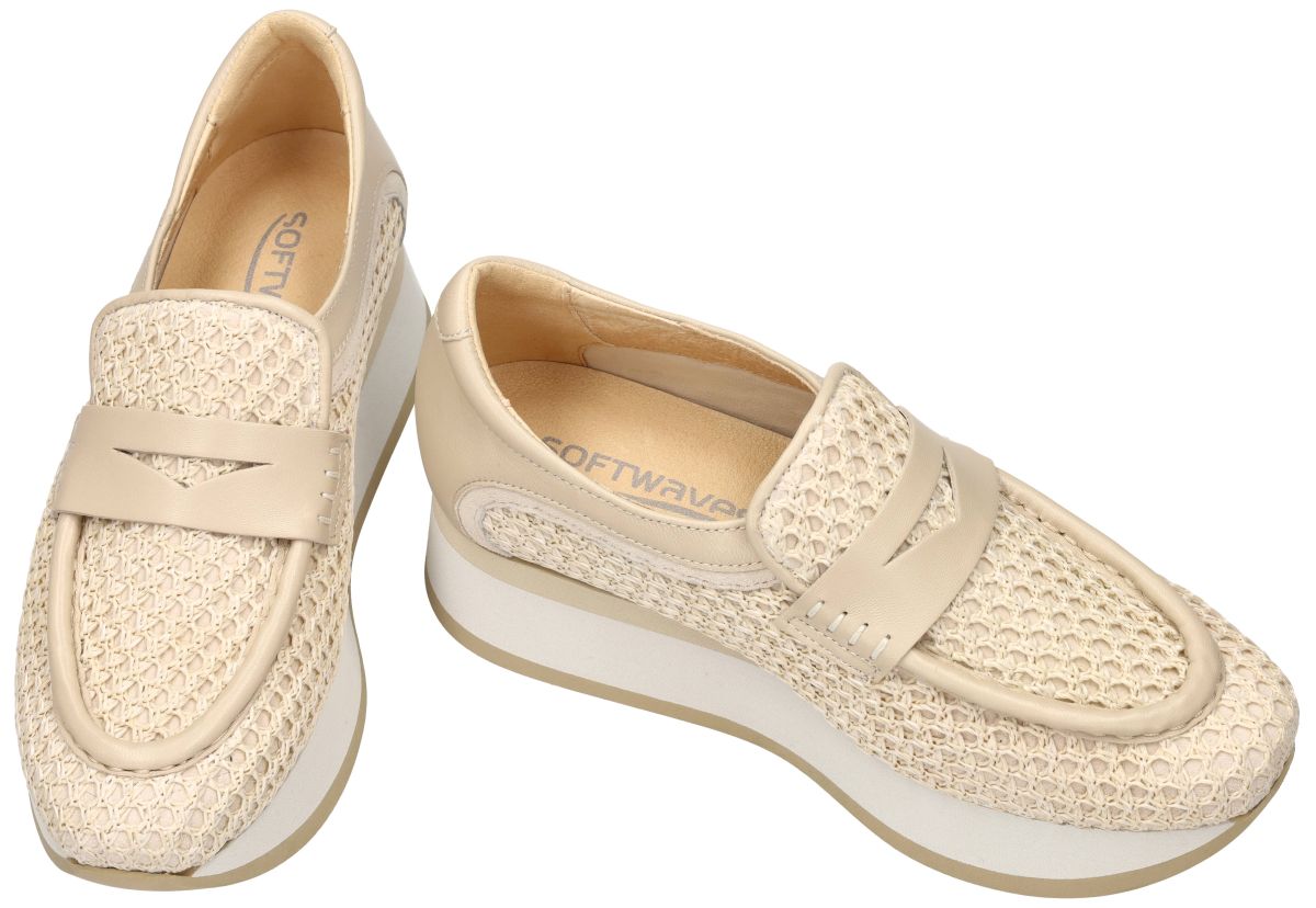 Softwaves CAELA Plateauzool Loafers - Coco/Almond. Til je dagelijkse stijl naar een hoger niveau met deze Caela loafers artikel 7.78.125 van het Portugese merk Softwaves. Deze elegante loafers in de verfijnde kleur coco/almond bieden een perfecte combinatie van tijdloos design, moderne details en uitzonderlijk draagcomfort. Ideaal voor zowel casual als meer geklede gelegenheden. De Softwaves Caela loafers zijn uitgevoerd in een crème/beige combinatie van gladleder met velour met daarover een raffia vlechtwerk. Het opengewerkte bovenwerk zorgt niet alleen voor een modieuze look, maar ook voor uitstekende ventilatie, waardoor deze schoenen perfect zijn voor warmer weer. De pennyloafer band over de wreef voegt een vleugje glamour toe aan het ontwerp. Comfortabele Plateauzool Deze loafers zijn voorzien van een lichtgewicht plateauzool van 4 cm dik, die een subtiele lift geeft zonder in te leveren op comfort. De zool in op elkaar liggende lagen zachte neutrale kleuren biedt extra grip en stabiliteit, waardoor je moeiteloos de hele dag kunt blijven lopen. Door het uitneembaar los voetbed is deze Softwaves Caela geschikt voor steunzolen en gemakkelijk te reinigen. Modieus en ademend voor optimaal comfort. Plateau van 4 cm voor een elegante en moderne uitstraling. Gemaakt met hoogwaardige materialen voor langdurig gebruik. Waarom kiezen voor deze unieke Softwaves Caela loafers? Met de Caela loafers in Coco/Almond haal je veelzijdigheid, stijl en draagcomfort in huis. Combineer ze met een jeans voor een casual look of draag ze met een chique broek voor een meer geklede outfit. Deze loafers zijn de perfecte keuze voor vrouwen die een vleugje elegantie willen toevoegen aan hun dagelijkse outfits. De nieuwste collectie Softwaves schoenen ontdekt men in onze schoenenwinkel regio Aalst, Ninove, Geraardsbergen, Zottegem, Liedekerke of kan men online shoppen op onze webshop.