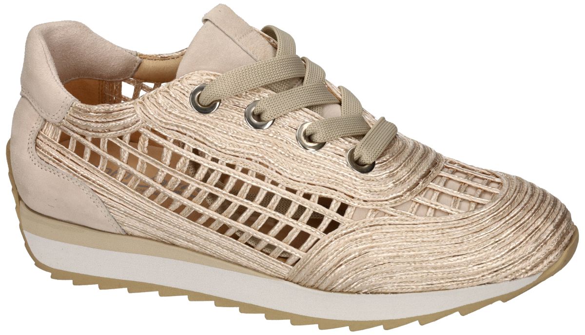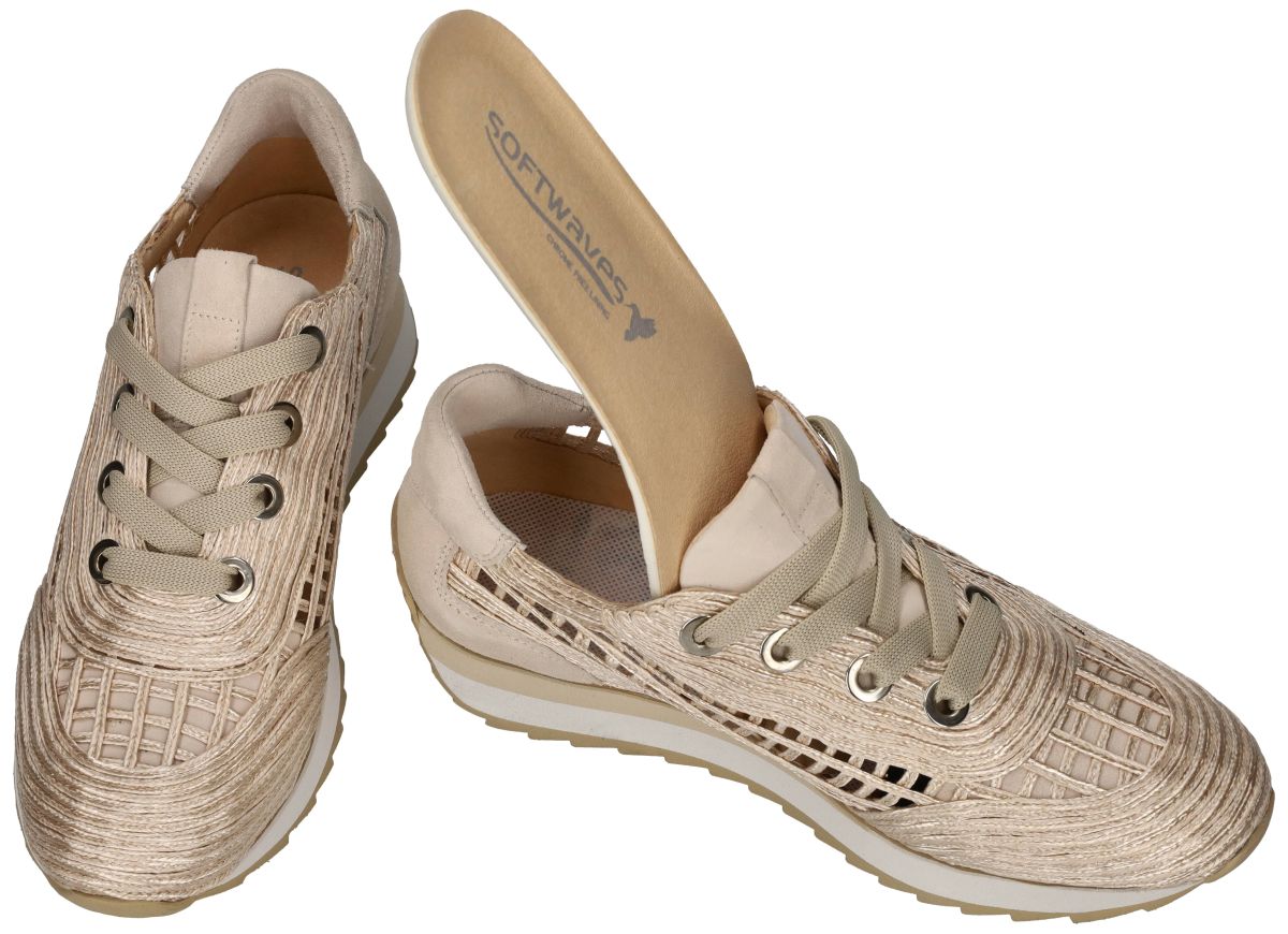 Deze Softwaves DELTA high fashion runner sneakers voor dames, artikelnummer 9.32.30, zijn een uitgesproken statement binnen de nieuwe lente/zomercollectie van het Portugese schoenenmerk Softwaves. Dit exclusieve model belichaamt een perfecte balans tussen luxueus design, innovatief materiaalgebruik en hoog draagcomfort. De sneaker onderscheidt zich door zijn unieke en bijzonder verfijnde upper, uitgevoerd in glanzend crème raffia touw dat kunstzinnig is verweven tot een luchtige, opengewerkte structuur. Deze opvallende textuur wordt elegant gecombineerd met zacht lichttaupe suède, wat zorgt voor een subtiel contrast en een warme, zomerse uitstraling met een duidelijk high-fashion karakter. De sportieve runner look met dynamische lijnen en een licht verhoogde zool geeft de DELTA-sneaker een moderne, eigentijdse flair. De lichtgewicht zool ondersteunt een natuurlijke afrol en maakt deze sneaker ideaal voor zowel actieve dagen als stijlvolle city-looks. Binnenin is het model afgewerkt met een volledig lederen binnenvoering, wat bijdraagt aan een aangenaam voetklimaat en een luxueus draaggevoel. Het uitneembare, met leder beklede voetbed verhoogt het comfort en maakt de sneaker ook geschikt voor het gebruik van persoonlijke steunzolen. De Softwaves DELTA (9.32.30) is een uitzonderlijke sneaker voor dames die kiezen voor originaliteit, luxe en verfijning. Een uitgesproken fashion piece dat comfort en exclusiviteit samenbrengt — een modieuze eyecatcher die niemand onopgemerkt zal laten. De nieuwe lente-zomer collectie van Softwaves is te koop in onze winkel regio Aalst, Ninove, Geraardsbergen, Liedekerke, Zottegem of kan men online bestellen op onze webshop