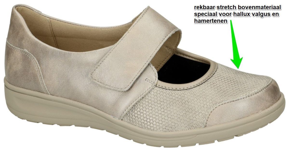 SOLIDUS (solicare soft) artikel/model 29503-20728 Kate cable/nerone flex 2 sasso/grey zijn hallux valgus en hamertenen schoenen. Het model 29503 sasso/grey Kate Solicare soft is een zilvergrijs metallic leder + beige/goud knitted print stretch leder comfort ergonomisch - orthopedische damesschoen met velcro of klittenband sluiting van het comfort-schoenenmerk SOLIDUS. De Solicare soft Kate heeft de SUPER BREED K-wijdte leest en een dikke uitneembare kurk binnenzool die anatomisch gevormd is en perfect functioneerd als steunzool maar eventueel ook vervangen kan worden door eigen steunzolen. Bovendien is er een super rekbaar stretch inzet boven en aan de zijkant van tenen waardoor deze comfortschoen uitermate geschikt is voor problemen met hallux valgus, hamertenen, en andere pijnlijke knobbels. Zeer geschikte damesschoen voor bejaarde dames en voor rheuma, diabetes en obesitas patiënten. Koop deze Solidus solicaresoft comfort damesschoenen in onze schoenenwinkel regio Aalst Ninove Geraardsbergen of bestel onlineop onze webshop. Is uw maat niet op voorraad op deze webshop? Contacteer ons dan trachten we u alsnog te helpen.Mogelijk van maat 35 tot maat 43 halve maten inclusief.