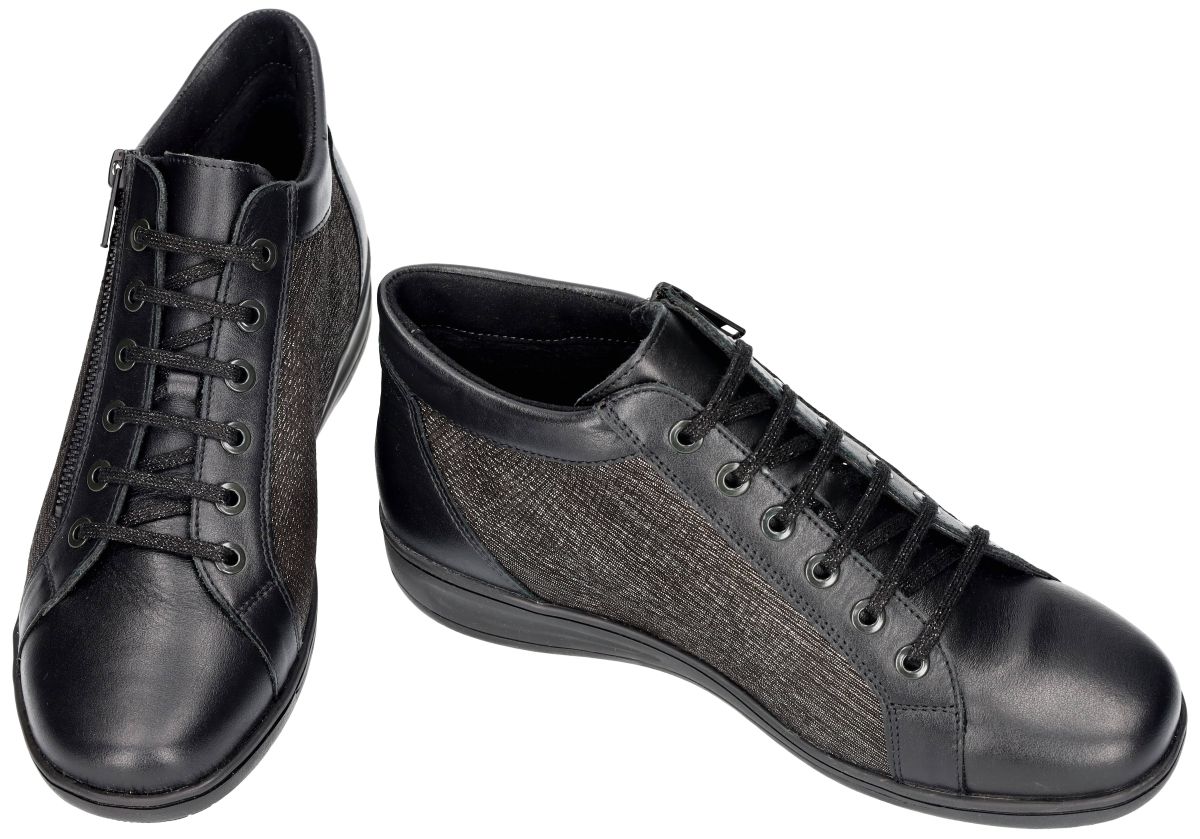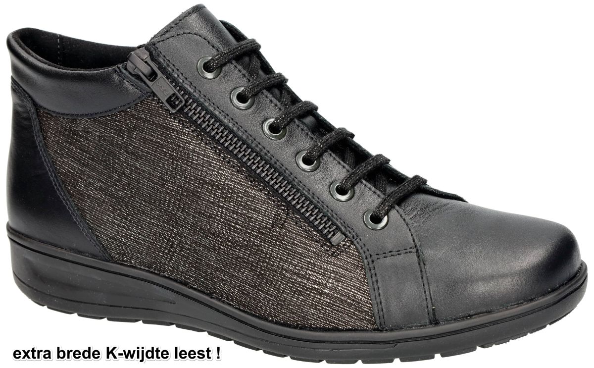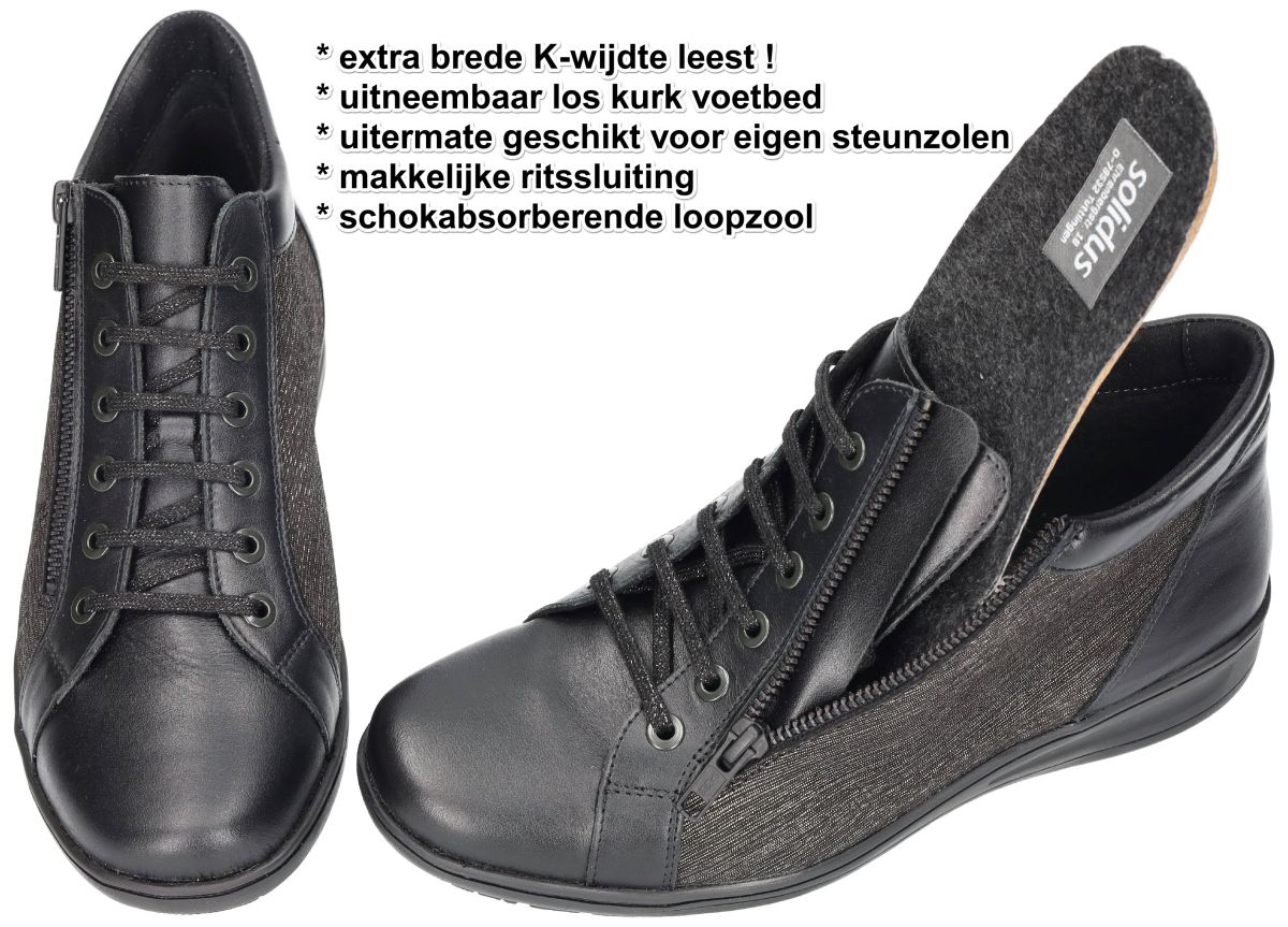 SOLIDUS artikel/model 29007-01293 KATE vitello/cheope schwarz/anthrazit zijn EXTRA BREDE zwart met fijne zilverprint comfort-orthopedische damesschoen bottines of hoge veterboots uit de herfst/winter 2025 collectie van het Duitse comfort-schoenenmerk SOLIDUS. Deze solidus bottines of hoge sneakers zijn uitgevoerd in een prachtige combinatie van zwart gladleder met een fijne zilver/grijze rasterprint en hebben een extra brede K-wijdte leest en een dikke uitneembare binnenzool zodat ook eigen steunzolen kunnen worden geplaatst. Zeer geschikte damesschoen bejaarde dames en voor rheuma, obesitas en diabetes patiënten. De binnenzool is orthopedisch voorgevormd en bestaat uit veerkrachtig natuurkurk overtrokken met warme vilt voering. De loopzool is antislip en luchtgepolsterd voor een schokdempende veerkrachtige stap. Deze mooie maar toch praktische bottines zijn voorzien van een makkelijke rits sluiting zodat aan en uitdoen kan zonder de veters los te maken. Mooie en modieuse sneaker voor zeer zware en brede voeten. Koop deze Solidus solicaresoft comfort damesschoenen in onze schoenenwinkel regio Aalst Ninove Geraardsbergen of bestel online op onze webshop. Is uw maat niet op voorraad? Mail of bel ons dan trachten we u alsnog te helpen.