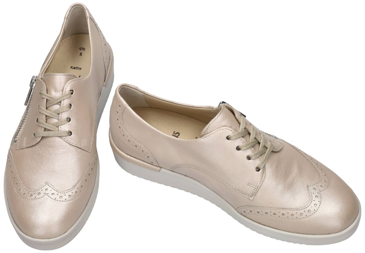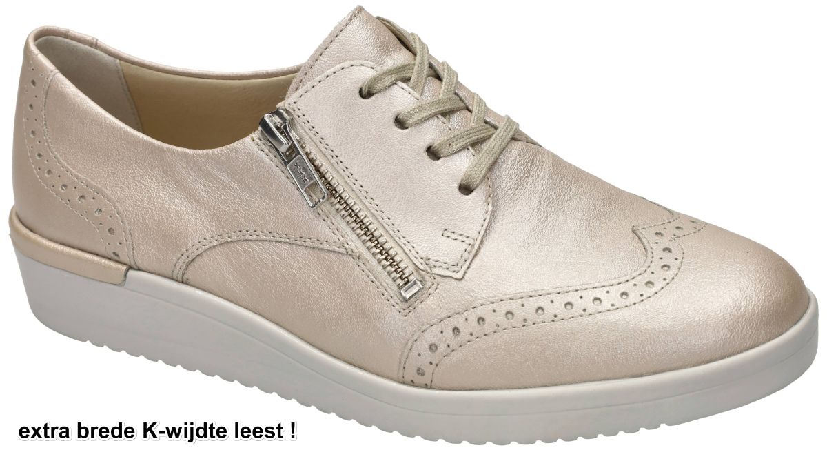 SOLIDUS artikel/model 51002-40699 KATHY 002 HILTON hielo zijn extra brede champagne kleur perlato leder of beige parelmoerleder comfort-orthopedische damesschoenen dandy derby lage veterschoenen of luxury sneakers van het Duitse comfort-schoenenmerk SOLIDUS. Deze sportieve beige parelmoer solidus platte veterschoen of sneaker heeft een bovenwerk vervaardigd in warm champagne metallic leder met brogues en neusvleugel als decoratie (oxford of collegestyle) en zijn bovendien voorzien van zowel veters als rits wat het aantrekken en uitdoen gemakkelijk maakt. Deze Solidus sneakers hebben een verborgen hakhoogte van 3,5 cm en hebben een extra brede K-wijdte leest en een dikke uitneembare binnenzool zodat ook eigen steunzolen kunnen worden geplaatst. Zeer geschikte damesschoen voor dames met een wat zwaardere of gezwollen voeten of voor rheuma, diabetes en obesitas patiënten. De binnenzool is orthopedisch voorgevormd en bestaat uit veerkrachtig natuurkurk overtrokken met leder voering. De loopzool is antislip en luchtgepolsterd voor een schokdempende veerkrachtige stap. Mooie en modieuse zomerse dames geklede veterschoenen voor zeer zware en brede voeten. Koop deze Solidus comfort damesschoenen in onze schoenenwinkel regio Aalst Ninove Geraardsbergen of bestel onlineop onze webshop. Mail of bel ons dan trachten we u alsnog te helpen
