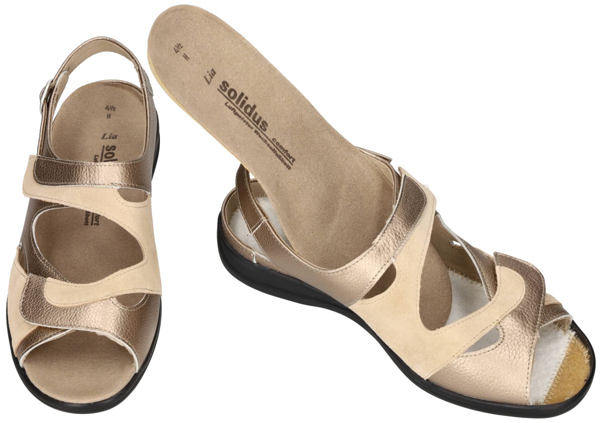 SOLIDUS steunzool sandalen artikel/model 73094-30818 LIA (H) champagne/savanna zijn goud metallic + beige velour comfort ergonomisch - orthopedische damesschoenen sandalen met klittenband sluiting van het comfort-schoenenmerk SOLIDUS. Deze extra brede zomer comfort damesschoen heeft een H-wijdte leest en een dikke uitneembare binnenzool die perfect kan vervangen worden door uw eigen steunzolen. Hoog-comfort damessandaal die zeer goed de voet omsluit en goed aanpasbaar is aan elk type voet. De binnenzool is orthopedisch voorgevormd en bestaat uit veerkrachtig latex overtrokken met echt leder. De loopzool is antislip en luchtgepolsterd voor een schokdempende veerkrachtige stap. Uitermate geschikt voor bejaarden, diabetici, obesitas patienten en minder mobiele personen vanwege de zeer goede steun en stabiliteit. Koop deze Solidus comfort damesschoenen in onze schoenenwinkel regio Aalst Ninove Geraardsbergen of bestel onlineop onze webshop. Is uw maat niet op voorraad op deze webshop? Contacteer ons dan trachten we u alsnog te helpen. Mogelijk van maat 35 tot maat 43 halve maten inclusief.