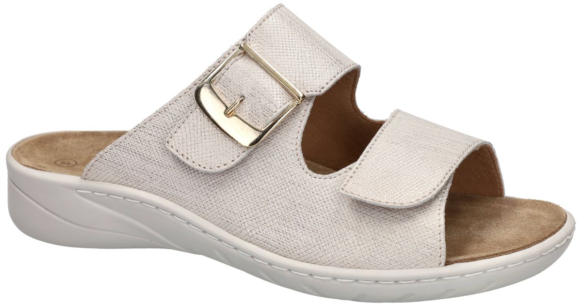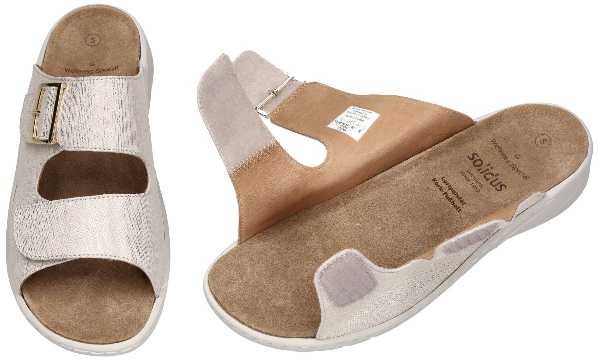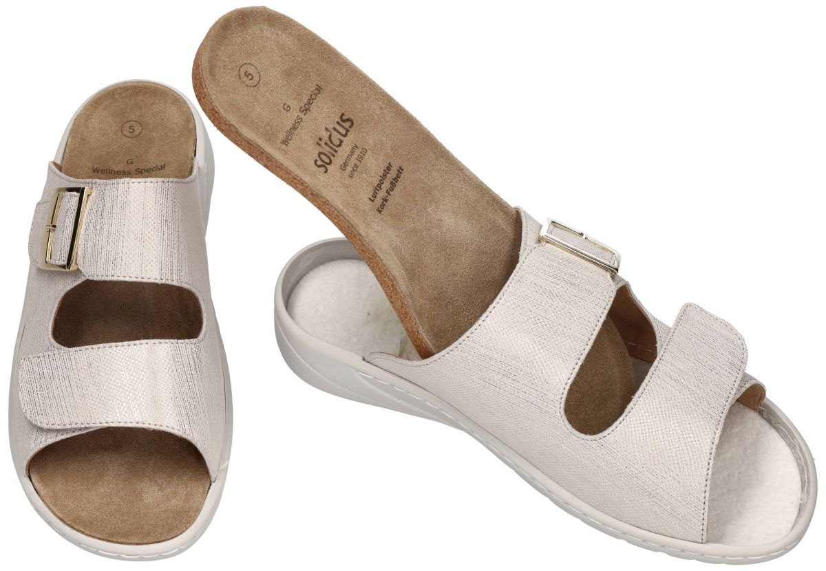 SOLIDUS artikel/model 20187-10341 Wellness Special Primark bianco zijn ecru witte leder met fijne gouden spikkeling damesschoenen hoogcomfort wellness slide slippers uit de nieuwe lente/zomer 2026 collectie van het Duitse comfort-schoenen merk Solidus. Deze wellnes damesslippers zijn uitgevoerd in ecru wit parelmoer-glans gladleder met daarop fijne metallic gouden lijntjes en spikkels en zijn perfect aanpasbaar aan elke voet door de 2 afzonderlijke klittenbandsluitingen (velcro). Deze solidus Wellness Special slide-slippers hebben een comfortabele G-wijdte leest voor de smalle tot gemiddelde vrouwenvoeten en zijn bovendien voorzien van een los uitneembaar voetbed dat indien gewenst ook kan vervangen worden door uw eigen steunzolen. Dankzij de ingebouwde dempingszones ervaar je de perfecte schokabsorptie en ideale drukverdeling. Tegelijkertijd biedt het uitneembaar ergonomisch gevormd voetbed extra ondersteuning en stimuleert het de voet om op natuurlijke wijze af te rollen. De comfortabele damesslipper is in de breedte G en is de ideaal voor fijne tot gemiddelde voeten. Met behulp van de twee klittenbandsluitingen kan aan elke wreefhoogte aangepast worden en geeft de slipper een perfecte pasvorm aan de voet en zorgt voor een stabiele grip. Dit wordt versterkt door de flexibele PU-zool, wat zorgt voor een optimaal loopcomfort. De uitneembare binnenzool maakt het ook mogelijk om steunzolen in de slipper te plaatsen. Solidus Wellness Special slippers vindt men in onze schoenenwinkel regio Aalst, Ninove, Geraardsbergen, Zottegem, Liedekerke of kan men online bestellen op onze webshop.