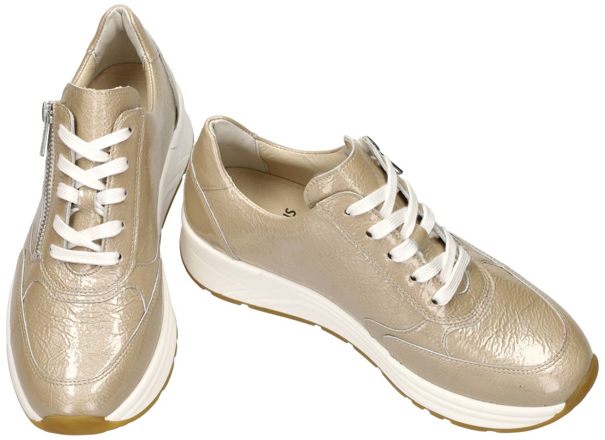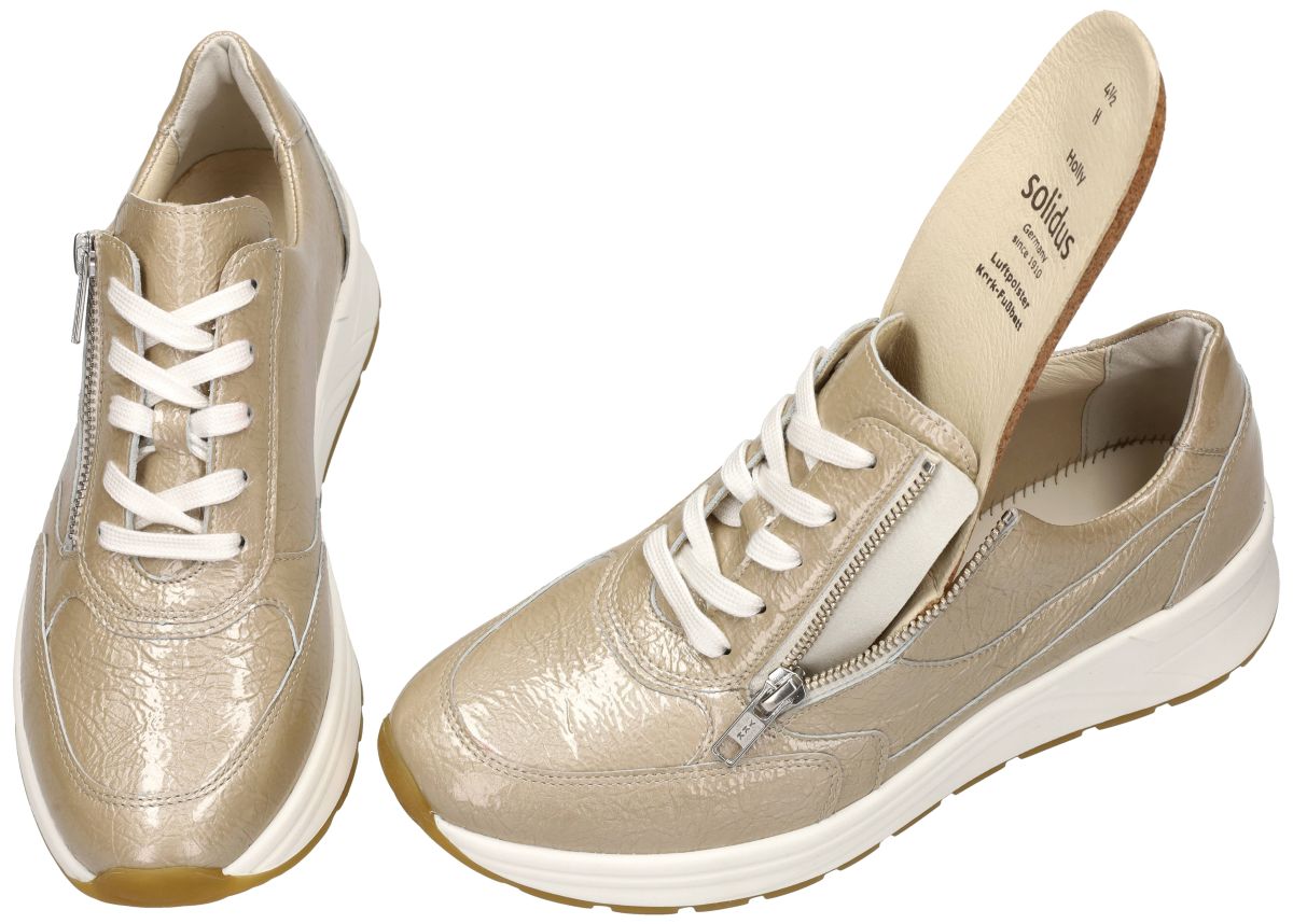 Deze hoogcomfort damessneakers / sportieve veterschoenen uit de lente-zomercollectie van Solidus combineren geavanceerde orthopedische ondersteuning met een verrassend jong en modieus design. Het model Holly, artikelnummer 46023, is uitgevoerd in 40688 Siviglia champagne, een elegante champagnekleurige kreukellak die deze comfortschoen een frisse, moderne uitstraling geeft. De sneaker is opgebouwd rond een subtiele wedgezool die de hiel ongeveer 3 cm optilt. Deze lichte verhoging zorgt voor een natuurlijke lichaamshouding en ontlast de onderrug en gewrichten. De zool is bovendien torsiestijf, een eigenschap die sterk wordt aangeraden door podologen en orthopedisten omdat ze de voet gecontroleerd begeleidt en overmatige verdraaiing voorkomt tijdens het stappen. Solidus staat bekend om zijn compromisloze comfort en dat is ook bij de Holly duidelijk voelbaar. De schoen is uitgevoerd op een H-wijdte leest, ideaal voor de iets bredere voet, en beschikt over een hoger oplopende wreef. Hierdoor blijft er ook bij het dragen van dikkere steunzolen voldoende ruimte in de schoen, zonder knelpunten of drukgevoel. Binnenin is de Holly afgewerkt met een volledig lederen binnenbekleding, wat zorgt voor een aangenaam en ademend voetklimaat. De naadloze binnenvoering aan de voorvoet voorkomt irritatie en maakt deze sneaker bijzonder geschikt voor gevoelige voeten. Het uitneembare voetbed, eveneens met leder bekleed, kan eenvoudig vervangen worden door eigen orthopedische inlegzolen. Extra comfort wordt geboden door de royale, zachte polstering rond de enkel, die de voet stabiel omsluit en schuren voorkomt, zelfs bij langdurig dragen. Ondanks zijn uitgesproken orthopedische eigenschappen oogt de Solidus Holly verrassend sportief en eigentijds, waardoor hij moeiteloos combineert met zowel casual als iets gekledere outfits. De Solidus Holly 46023 is daarmee de perfecte keuze voor vrouwen die geen compromissen willen sluiten tussen medisch verantwoord comfort, pasvorm op maat en een modieuze, hedendaagse look. Koop deze Solidus solicare comfort damesschoenen in onze schoenenwinkel regio Aalst Ninove Geraardsbergen of bestel onlineop onze webshop. Mail of bel ons dan trachten we u alsnog te helpen.