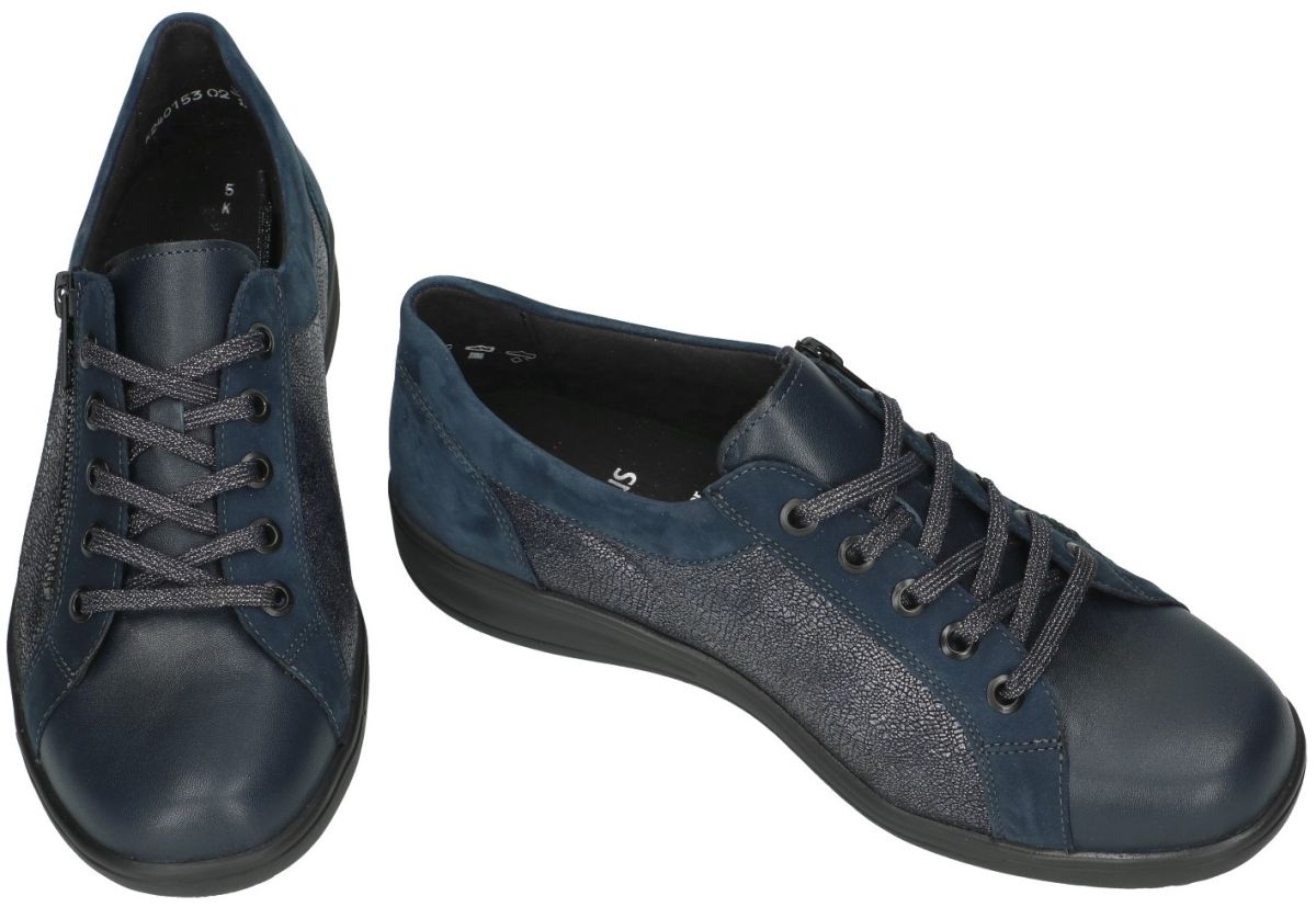 SOLIDUS artikel/model 29001-80378 KATE (K) vitello/nubuk/serenity ocean zijn extra brede donker blauwe comfort-orthopedische damesschoenen veterschoenen sneakers van het Duitse comfort-schoenenmerk SOLIDUS. Deze donkerblauwe (marineblauw) solidus sportieve veterschoen sneaker heeft de extra brede K-wijdte leest en een dikke uitneembare binnenzool zodat ook eigen steunzolen kunnen worden geplaatst. Zeer geschikte damesschoen voor bejaarde dames en voor rheuma, diabetes en obesitas patiënten. De binnenzool is orthopedisch voorgevormd en bestaat uit veerkrachtig natuurkurk overtrokken met leder voering. Ook de binnenvoering is volledig in leder. De loopzool is antislip en luchtgepolsterd voor een schokdempende veerkrachtige stap. Deze mooie maar toch praktische sneakers zijn voorzien van een makkelijke rits sluiting zodat aan en uitdoen kan zonder de veters los te maken. Mooie en modieuse sneaker voor zeer zware en brede voeten. Koop deze Solidus solicaresoft comfort damesschoenen in onze schoenenwinkel regio Aalst Ninove Geraardsbergen of bestel onlineop onze webshop. Mail of bel ons dan trachten we u alsnog te helpen.