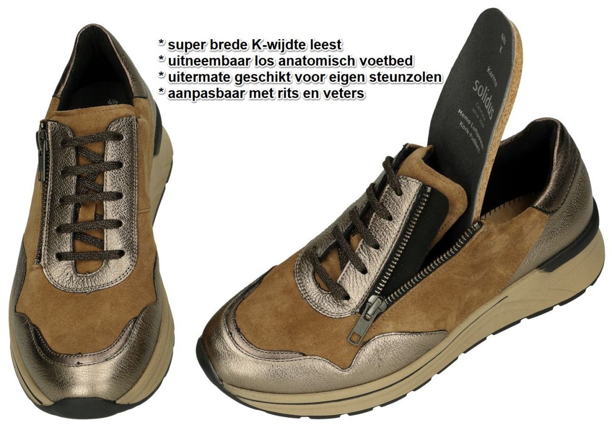 SOLIDUS artikel/model 59071-30538 KARMA fango multi zijn super brede bruin nubuk + brons metallic damesschoen veterschoen sneakers meer bepaald chunky sneakers of runners van het Duitse comfort-schoenenmerk SOLIDUS. Deze mooie combinatie solidus sportieve veterschoen heeft een extra brede K-wijdte leest en een dikke uitneembare kurk binnenzool zodat ook eigen steunzolen kunnen worden geplaatst. Zeer geschikte damesschoen voor bejaarde dames en voor rheuma, diabetes en obesitas patiënten. De binnenzool is orthopedisch voorgevormd en bestaat uit veerkrachtig natuurkurk overtrokken met leder voering. De dikke chunky plateau loopzool is antislip en luchtgepolsterd voor een schokdempende veerkrachtige stap. Deze opvallende maar toch praktische sneakers zijn voorzien van een makkelijke rits sluiting zodat aan en uitdoen kan zonder de veters los te maken. Mooie en modieuse chunky sneakers voor zeer zware en brede voeten. Koop deze Solidus solicaresoft comfort damesschoenen in onze schoenenwinkel regio Aalst Ninove Geraardsbergen of bestel onlineop onze webshop. Mail of bel ons dan trachten we u alsnog te helpen.