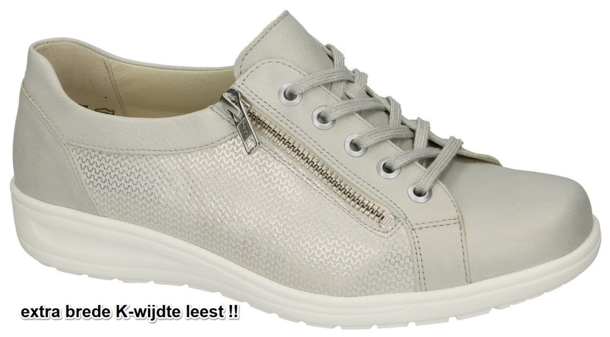 SOLIDUS artikel/model 29001-10299 KATE (K) kermit/treccia space/weiss zijn extra brede beige/grijs + goud patroon print comfort-orthopedische damesschoenen veterschoenen sneakers van het Duitse comfort-schoenenmerk SOLIDUS. Deze bleek-grijze solidus sportieve veterschoen sneaker heeft de extra brede K-wijdte leest en een dikke uitneembare binnenzool zodat ook eigen steunzolen kunnen worden geplaatst. Zeer geschikte damesschoen voor bejaarde dames en voor rheuma, diabetes en obesitas patiënten. De binnenzool is orthopedisch voorgevormd en bestaat uit veerkrachtig natuurkurk overtrokken met leder voering. Ook de binnenvoering is volledig in leder. De loopzool is antislip en luchtgepolsterd voor een schokdempende veerkrachtige stap. Deze mooie maar toch praktische sneakers zijn voorzien van een makkelijke rits sluiting zodat aan en uitdoen kan zonder de veters los te maken. Mooie en modieuse sneaker voor zeer zware en brede voeten. Koop deze Solidus solicaresoft comfort damesschoenen in onze schoenenwinkel regio Aalst Ninove Geraardsbergen of bestel onlineop onze webshop. Mail of bel ons dan trachten we u alsnog te helpen.