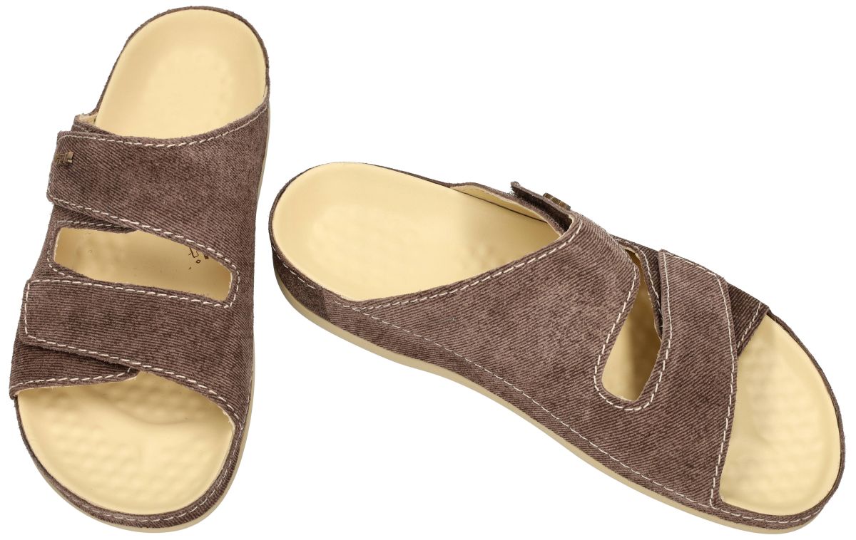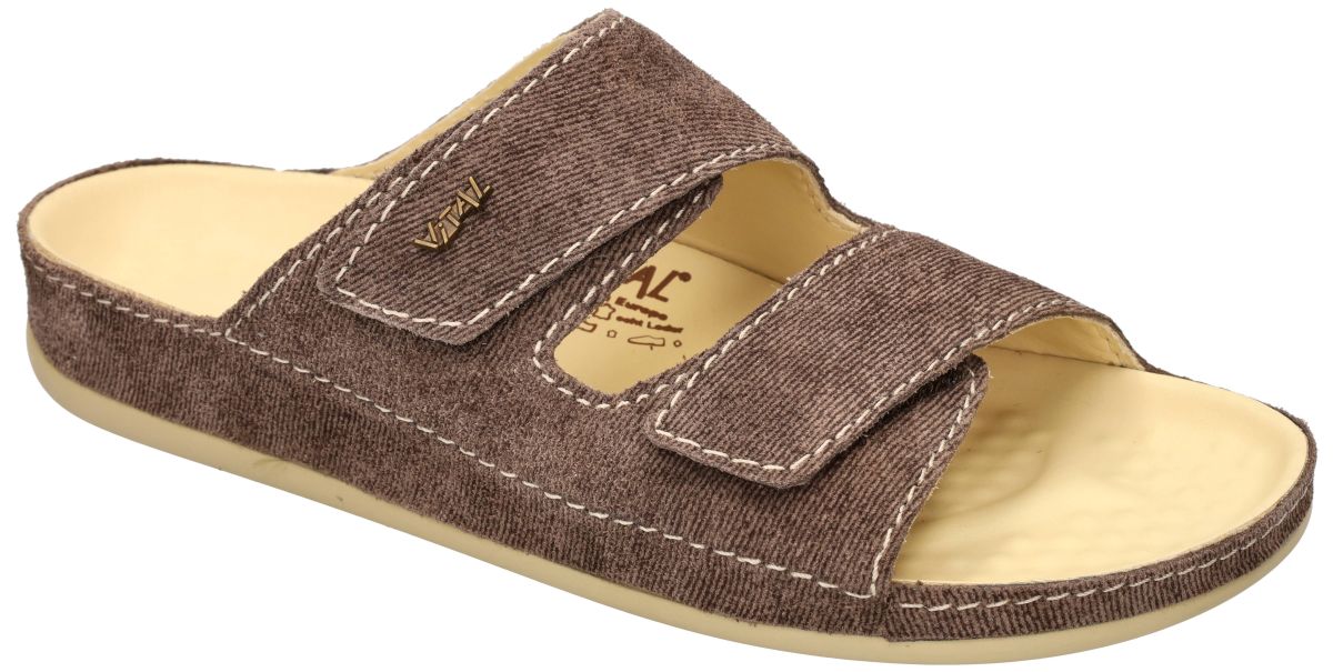 Deze Vital heren slippers artikel 356207 jeans stone combineren stijl met welzijn. Deze Oostenrijkse mannen Vital slippers hebben een unieke upper vervaardigd in een donkerbruin suède met jeans-look en zijn uitgerust met het vermaarde speciaal anti-spatader voetbed dat een masserende werking heeft op de voetzool. Deze noppen stimuleren de reflexzones van de voet, bevorderen de bloedsomloop en helpen vermoeide en zware benen te verlichten. Daarnaast zorgen ze voor totale ontspanning en ondersteunen ze de afvoer van lymfe en het verwijderen van gifstoffen. Het speciale voetbed is sterk anatomisch gevormd en door de kuip aan de hiel wordt de voet op de juiste plaats en in de juiste stand op het voetbed gehouden. De bobbeltjes masseren en stimuleren de ganse dag de voetzolen en zorgen voor een beter bloedcirculatie in de voeten en benen. Door de klittenbanden of velcrosluitingen bovenaan de wreef is deze heren muil of slipper aanpasbaar aan elke voet. Mannen die de Vital schoenen eenmaal gedragen hebben willen nooit meer andere pantoffels dan deze. Vital heren slippers, sloffen, pantoffels vindt men in onze schoenenwinkel regio Aalst, Ninove, Geraardsbergen, Zottegem, Liedekerke of kan men online bestellen op onze webshop.