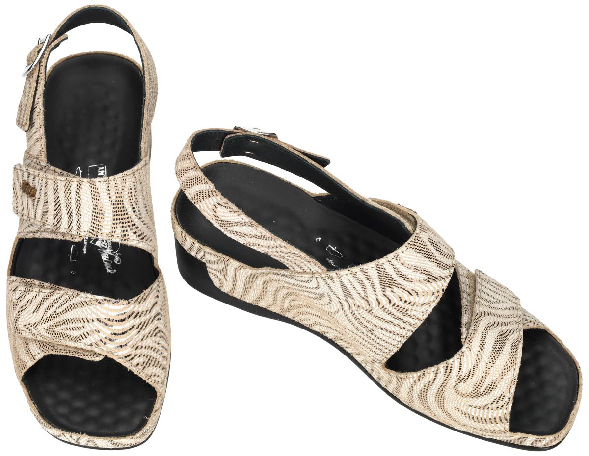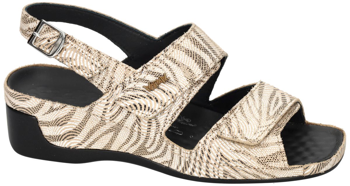 VITAL artikel/model 296502 TINA Zebra Beige zijn offwhite/beige met zebra-strepen print damesschoenen comfort gezondheids sandalen (sleehaksandaal) van de Oostenrijkse schoenenmerk VITAL anti-spatader. Deze VITAL sandalen zijn uitgevoerd in een goud/beige/wit zebraprint en staan op een comfortabele en stabiele sleehak van 4 cm en is voorzien van gemakkelijke en aanpasbare klittenbandsluiting of velcrosluiting over de wreef. VITAL relax - massage schoenen zijn gekend om hun perfecte afwerking en hun heilzame werking op de bloedsomloop in de voeten en benen. Door de gebobbelde binnenzool waardoor spataders worden voorkomen. De Vital schoenzool heeft immers een dubbele werking: Door zijn massage van de voetzool wordt de bloedcirculatie en de werking van het bloedvatenstelsel in de voetzool bevordert en ontspant zo uw benen en gaat ook spataders vorming tegen. Eveneens worden de reflex kringloop-zones onderaan de voetzool heilaam gestimuleerd die de functies van verschillende lichaamsorganen regelen. Alles samen zorgt dit voor een totale ontspanning van het hele lichaam. VITAL slippers en muiltjes schoenen vindt u in onze schoenenwinkel regio Aalst, Ninove, Geraardsbergen of u kan online bestellen op onze webshop.