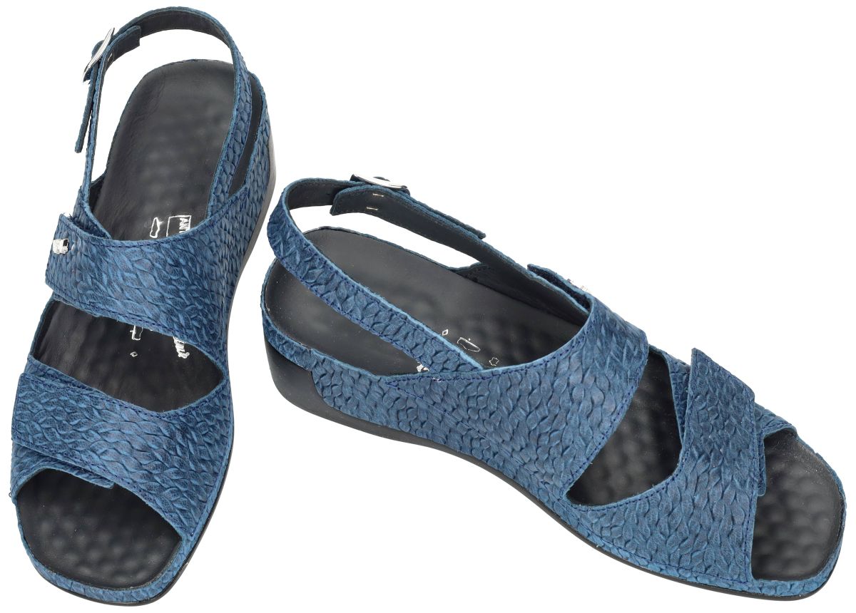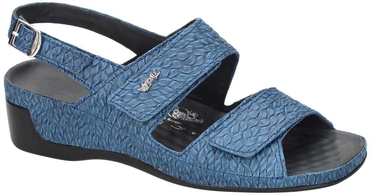 VITAL artikel/model 206506 TINA Valkeria Blau zijn blauwe met een vlecht print damesschoenen comfort gezondheids sandalen (sleehaksandaal) uit de nieuwe lente/zomer collectie 2026 van de Oostenrijkse schoenenfabrikant en schoenenmerk VITAL antivarice - anti-spatader. Deze VITAL sandalen zijn uitgevoerd in een cobaltblauw leder met uitgesproken vlecht-print en staat op een comfortabele en stabiele sleehak van 4 cm en is voorzien van gemakkelijke en aanpasbare klittenbandsluiting of velcrosluiting over de wreef. VITAL relax - massage schoenen zijn gekend om hun perfecte afwerking en hun heilzame werking op de bloedsomloop in de voeten en benen. Door de gebobbelde binnenzool waardoor spataders worden voorkomen. De Vital schoenzool heeft immers een dubbele werking: Door zijn massage van de voetzool wordt de bloedcirculatie en de werking van het bloedvatenstelsel in de voetzool bevordert en ontspant zo uw benen en gaat ook spataders vorming tegen. Eveneens worden de reflex kringloop-zones onderaan de voetzool heilaam gestimuleerd die de functies van verschillende lichaamsorganen regelen. Alles samen zorgt dit voor een totale ontspanning van het hele lichaam. VITAL slippers en muiltjes schoenen vindt u in onze schoenenwinkel regio Aalst, Ninove, Geraardsbergen of u kan online bestellen op onze webshop.