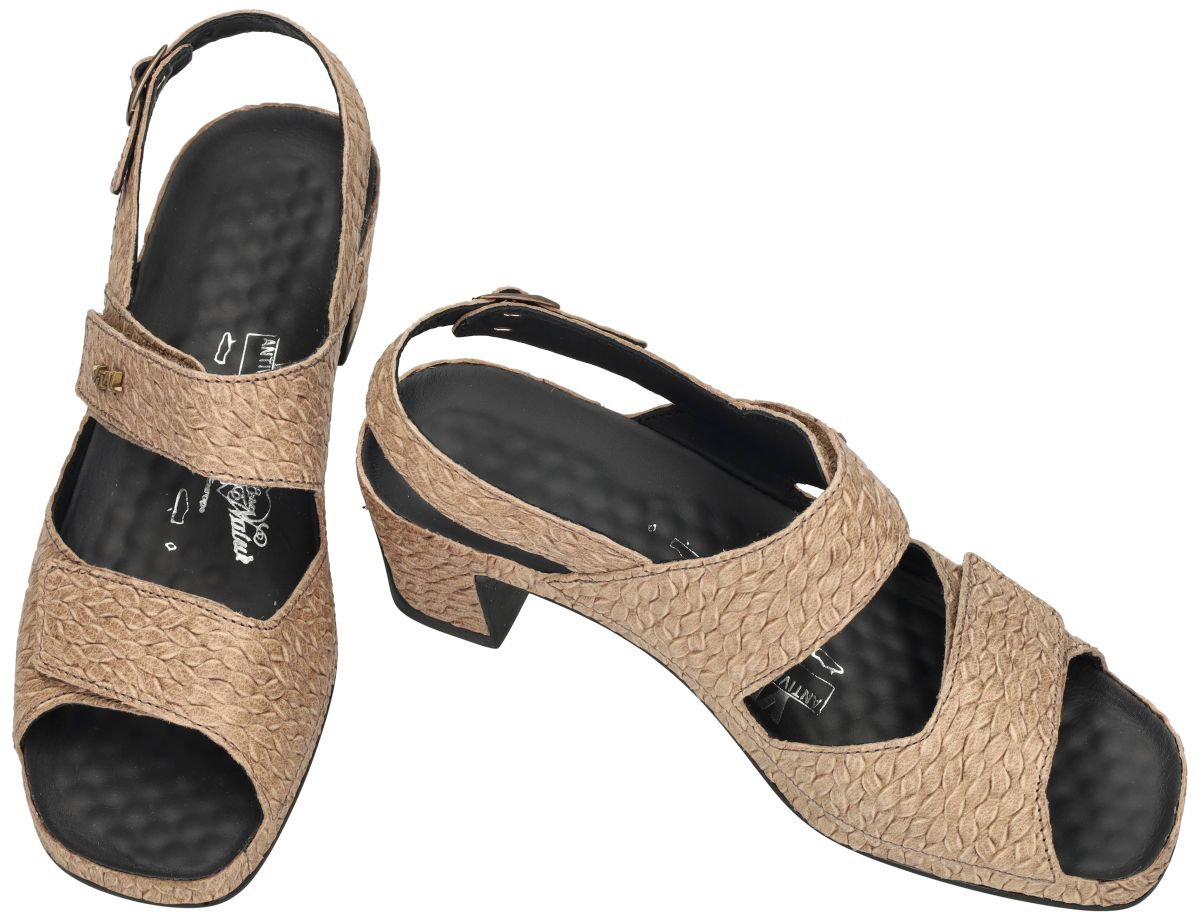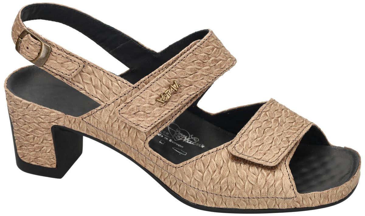 Deze wellness sandalen van het Oostenrijkse schoenenmerk Vital, model Joy (artikel 201974) in de uitvoering Valkiria Schlamm, combineren elegantie met uitzonderlijk comfort. Het bovenwerk in lichtbruin leder met een uitgesproken vlechtprint geeft deze sandaal een stijlvolle en tijdloze uitstraling, perfect voor zomerse outfits. De comfortabele blokhak lift de hiel ongeveer 5 cm en zorgt voor een stabiele en vrouwelijke houding. Dankzij de verstelbare klittenbandsluiting en het hielriempje met gesp geniet u van een veilige en persoonlijke pasvorm. Het typische Vital massagevoetbed met subtiele noppen stimuleert de reflexzones onder de voet, bevordert de bloedsomloop en helpt vermoeide voeten en zware benen te verlichten. Bovendien ondersteunt het de natuurlijke lichaamshouding en zorgt het voor een aangenaam, ontspannen loopgevoel. Een ideale keuze voor dames die gezondheid, comfort en een elegante look willen combineren. VITAL sandalen vindt u in onze schoenenwinkel regio Aalst, Ninove, Geraardsbergen, Zottegem, Liedekerke of u kan online bestellen op onze webshop.