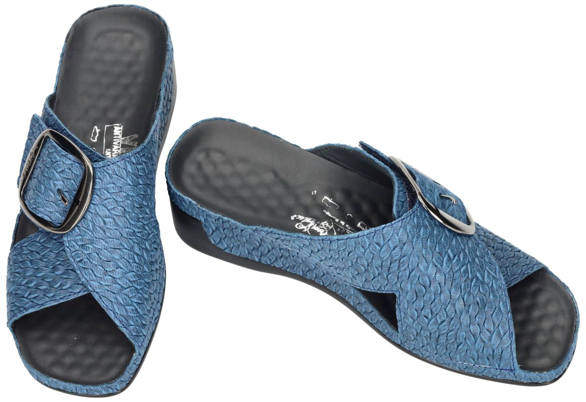 Vital Tina 206656 Valkira Blau Wellness sleehakslippers met antivarice massagevoetbed. Ontdek ultieme ontspanning met deze wellness sleehakslippers uit de nieuwste lente/zomercollectie van het Oostenrijkse comfortschoenenmerk Vital. Het model Tina 206656 in de uitvoering Valkira Blau combineert modieuze uitstraling met een uitgesproken gezondheidsbevorderend karakter. Deze elegante slipper in diep blauw reliëfleder met vlechtwerk patroon is voorzien van een stabiele sleehak die de hiel 4 cm optilt. Dankzij deze lichte verhoging wordt het lichaamsgewicht optimaal verdeeld en wordt de druk op knieën, heupen en onderrug merkbaar verminderd. De brede klittenbandband schuin over de wreef zorgt voor een perfecte, individueel aanpasbare pasvorm. De grote metalen gesp geeft de slipper een stijlvolle uitstraling, maar is louter decoratief. Het comfort zit volledig in de praktische klittenbandsluiting. Vital Relax Massage & Antivarice werking . Vital staat al jaren bekend om zijn Relax- en massageschoenen met heilzame werking op de bloedsomloop. Het geheim zit in het anatomisch gevormde, gebobbelde voetbed. De speciale structuur van de binnenzool heeft een dubbele werking: Stimuleert door zachte massage de bloedcirculatie in de voetzool , Bevordert de werking van het bloedvatenstelsel , Helpt spatadervorming (antivarice-effect) tegen te gaan . Ontspant vermoeide voeten en zware benen. Activeert reflexzones die in verbinding staan met verschillende lichaamsorganen. Door de continue microstimulatie tijdens het stappen worden de reflexkringloopzones onder de voet geactiveerd. Dit ondersteunt niet alleen de lokale doorbloeding, maar draagt bij aan een totale ontspanning van het hele lichaam. Ideaal voor wie gevoelig is aan vermoeide of zware benen, lang rechtstaat of extra circulatieondersteuning wenst. Hoogwaardige afwerking & draagcomfort. De Vital Tina onderscheidt zich bovendien door: Perfecte Oostenrijkse afwerking. Zacht en duurzaam bovenmateriaal met luxueuze structuur. Comfortabele, stabiele zool met goede grip. Open teen voor luchtig zomercomfort. De combinatie van wellness, stabiliteit en elegant design maakt deze sleehakslipper niet alleen een comfortabele keuze, maar ook een stijlvolle aanvulling op uw zomergarderobe. Vital Tina 206656 Valkira Blau Voor wie comfort, gezondheid en elegantie moeiteloos wil combineren. VITAL slippers en muiltjes schoenen vindt u in onze schoenenwinkel regio Aalst, Ninove, Geraardsbergen, Zottegem of u kan online bestellen op onze webshop.