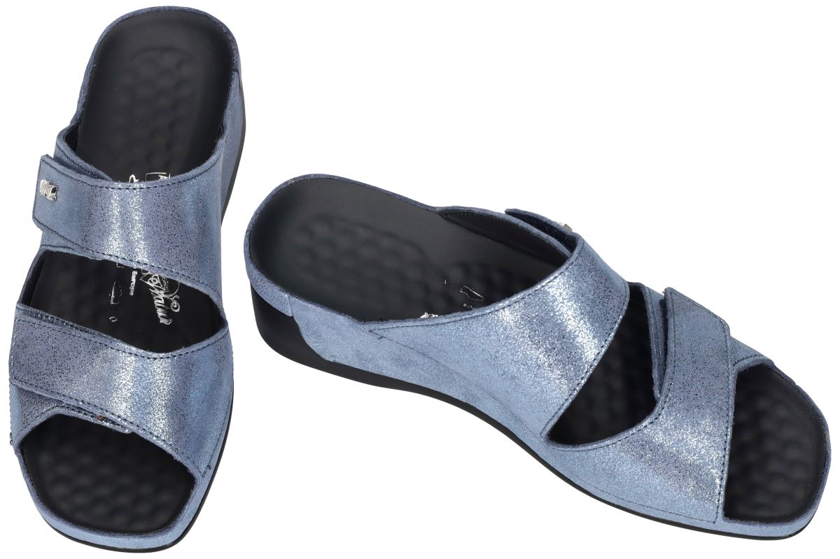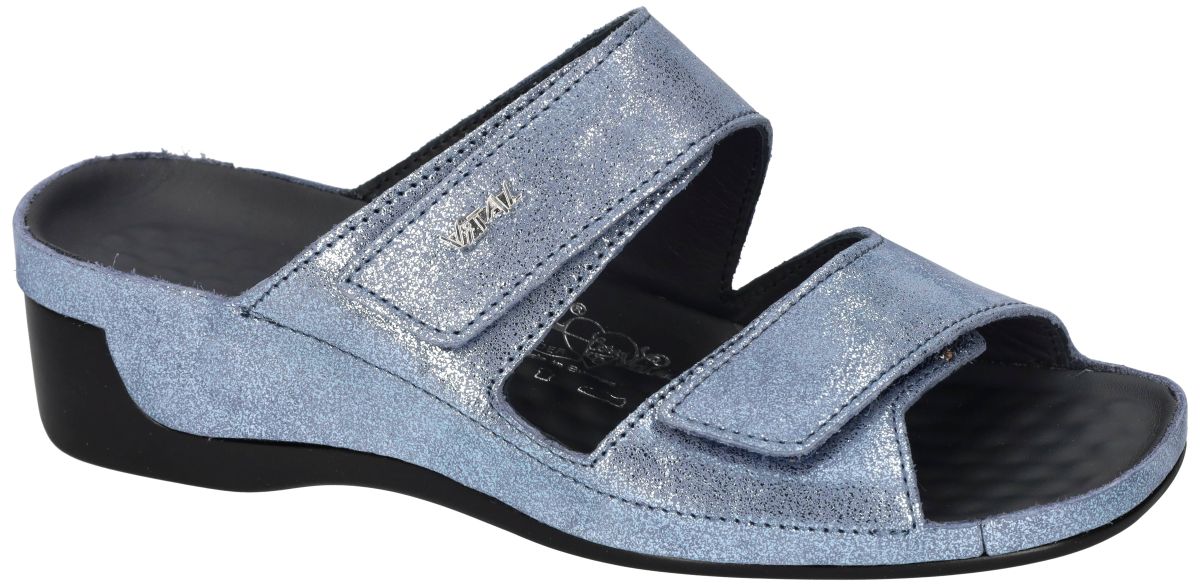 Ontdek ultiem comfort en wellness met deze elegante sleehak slippers van het Oostenrijkse schoenenmerk Vital. Het model Tina – artikelnummer 19606 in de uitvoering Creta Aqua combineert gezondheid, kwaliteit en een frisse zomerse uitstraling in één verfijnd ontwerp. Deze Vital Tina is uitgevoerd in aqua blauw glinster-nubuck, een subtiel sprankelend leder dat het licht mooi opvangt en zorgt voor een luxueuze, zomerse uitstraling. De zachte metallic nuance geeft de slipper een moderne en stijlvolle toets, terwijl de afwerking typisch Vital garant staat voor duurzaamheid en vakmanschap. De stabiele sleehak van 4 cm lift de hiel lichtjes op, wat zorgt voor een natuurlijke houding en een aangename drukverdeling. Dankzij de twee verstelbare klittenbandsluitingen over de wreef past u de slipper eenvoudig aan uw voet aan voor een perfecte, persoonlijke pasvorm. Binnenin geniet u van een volledig leren binnenwerk en lederen voetbed, wat zorgt voor een ademend en huidvriendelijk draagcomfort. Zoals alle Vital wellness-modellen beschikt deze Tina over het kenmerkende gebobbelde massagevoetbed. Dit unieke voetbed heeft een dubbele werking: De subtiele massage van de voetzool stimuleert de bloedcirculatie. Het ondersteunt het bloedvatenstelsel in de voet en helpt vermoeide benen te ontspannen. De activering van de reflexzones onder de voetzool stimuleert verschillende lichaamsfuncties. Het bevordert een betere doorbloeding en draagt bij aan een algemeen gevoel van ontspanning. Dankzij deze wellness-eigenschappen staat Vital bekend als dé specialist in comfort- en massageschoenen. De combinatie van ondersteuning, lichte hielverhoging en stimulerende zool maakt deze slippers bijzonder geschikt voor wie comfort en gezondheid belangrijk vindt. Een perfecte keuze voor wie stijlvolle zomerslippers zoekt met een bewezen heilzame werking op voeten en benen. Met de Vital Tina Creta Aqua kiest u voor comfort, gezondheid en een frisse, elegante uitstraling in één. VITAL slippers en muiltjes schoenen vindt u in onze schoenenwinkel regio Aalst, Ninove, Geraardsbergen, Zottegem of u kan online bestellen op onze webshop.