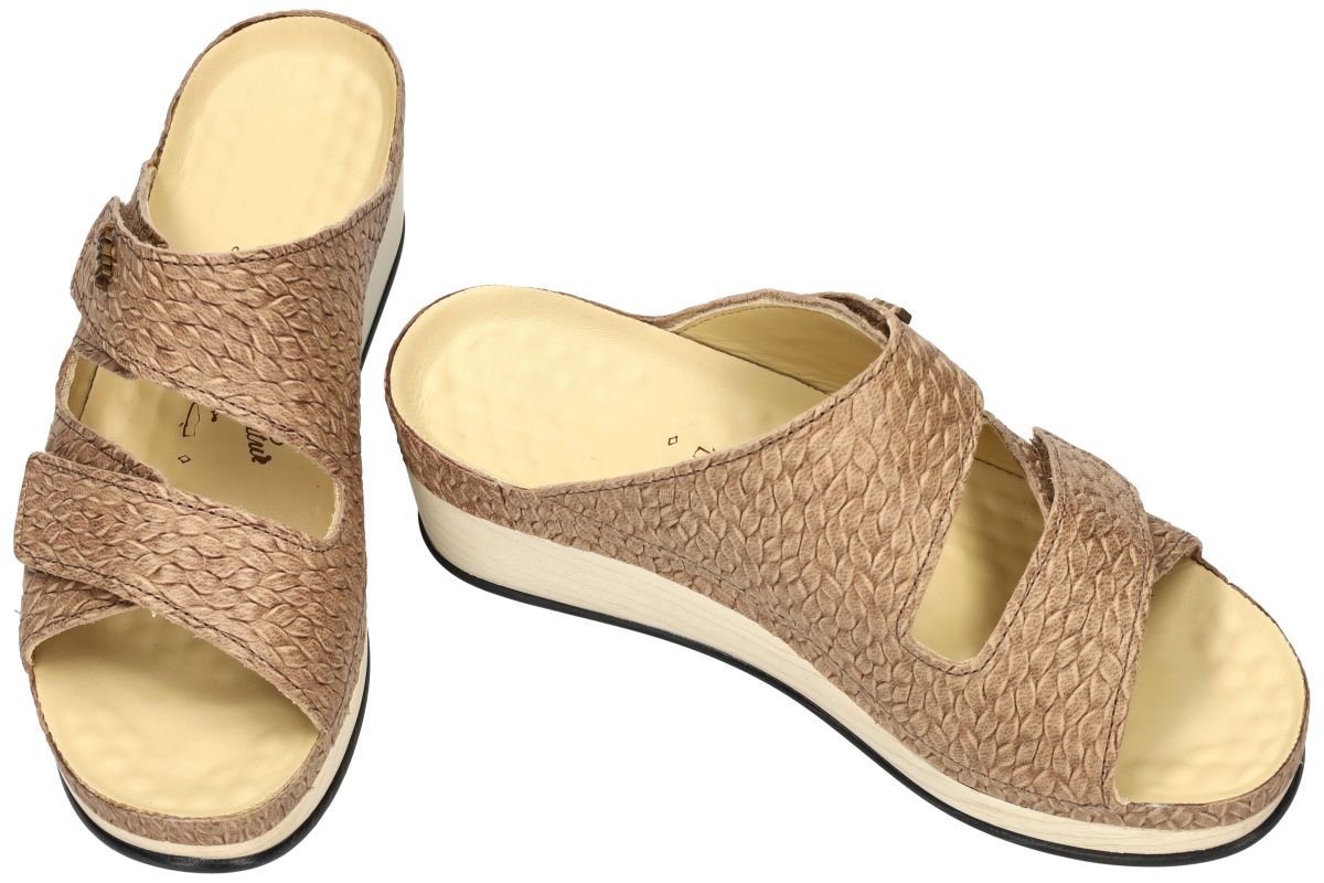 VITAL artikel/model 201334 LARA Valkiria Schlamm zijn lichtbruine of aardekleurige met een uitgesproken vlechtprint damesschoenen comfort gezondheids plateauzool slippers of muiltjes uit de nieuwe lente/zomer 2026 collectie van de Oostenrijkse schoenenfabrikant en schoenenmerk VITAL antivarice - anti-spatader. Deze modieuze, hippe VITAL slipper muiltjes zijn uitgevoerd in een lichtbruin of aardetint leder met een opvallende vlechten print en staat op een dikke beige dennenhoutprint plateau zool van 3,5 cm dik (vooraan 2,5 cm en achteraan 6 cm) en is voorzien van gemakkelijke en aanpasbare klittenbandsluiting of velcrosluiting over de wreef. VITAL relax - massage schoenen zijn gekend om hun perfecte afwerking en hun heilzame werking op de bloedsomloop in de voeten en benen. Door de gebobbelde binnenzool waardoor spataders worden voorkomen. De vital schoenzool heeft immers een dubbele werking: Door zijn massage van de voetzool wordt de bloedcirculatie en de werking van het bloedvatenstelsel in de voetzool bevordert en ontspant zo uw benen en gaat ook spatader vorming tegen. Eveneens worden de reflex kringloop-zones onderaan de voetzool gestimuleerd die de functies van verschillende lichaamsorganen regelen. Alles samen zorgt dit voor een totale ontspanning. VITAL slippers en muiltjes schoenen vindt u in onze schoenenwinkel regio Aalst, Ninove, Geraardsbergen, Zottegem, Liedekerke of u kan online bestellen op onze webshop.