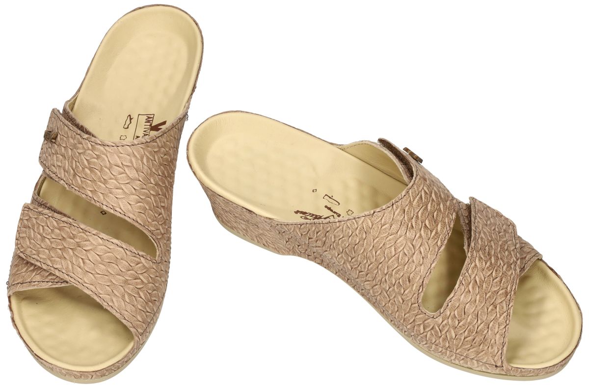 VITAL artikel 20544 model EVA Valkiria Schlamm zijn lichtbruine/taupe comfort gezondheids slippers of muiltjes van het schoenenmerk VITAL anti-spatader. Deze VITAL slipper-muiltjes zijn uitgevoerd in een lichtbruin leder met uitgesproken vlechten print en staan op een comfortabele en stabiele sleehak van 4 cm en is voorzien van gemakkelijke en aanpasbare klittenbandsluiting of velcrosluiting over de wreef. VITAL relax - massage schoenen zijn gekend om hun perfecte afwerking en hun heilzame werking op de bloedsomloop in de voeten en benen door de gebobbelde binnenzool waardoor spataders worden voorkomen. De Vital schoenzool heeft immers een dubbele werking: Door zijn massage van de voetzool wordt de bloedcirculatie en de werking van het bloedvatenstelsel in de voetzool bevordert en ontspant zo uw benen en gaat ook spataders vorming tegen. Eveneens worden de reflex kringloop-zones onderaan de voetzool heilaam gestimuleerd die de functies van verschillende lichaamsorganen regelen. Alles samen zorgt dit voor een totale ontspanning van het hele lichaam. VITAL slippers en muiltjes schoenen vindt u in onze schoenenwinkel regio Aalst, Ninove, Geraardsbergen, Zottegem, Liedekerke of u kan online bestellen op onze webshop.