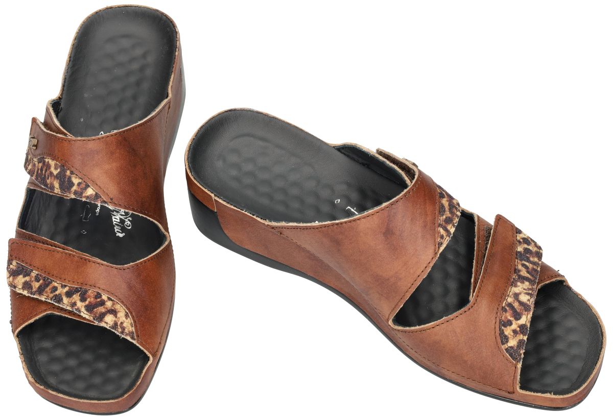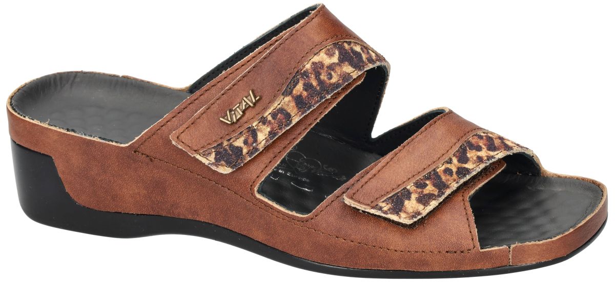 Vital slippers 6397 Nappa Tabak / Mutino Vanille – comfort en design in één. Deze slippers van het Oostenrijkse kwaliteitsmerk Vital combineren een modieuze uitstraling met het gekende voetcomfort waar het merk al decennia om geroemd wordt. Het model Tina artikelnummer 6397 is uitgevoerd in een donker cognac bruin of tabakbruin leder met een speels luipaard-print decoratie. De twee brede banden zijn voorzien van praktische klittenbandsluitingen, zodat de pasvorm eenvoudig aan uw voet kan worden aangepast. Het anatomisch gevormde voetbed is uitgevoerd met de bekende Vital noppenstructuur, die de doorbloeding stimuleert en zorgt voor een zacht massage-effect tijdens het lopen. Dit maakt de slippers niet alleen comfortabel, maar ook bevorderlijk voor de gezondheid van uw voeten. De stevige maar lichtgewicht zool biedt stabiliteit en schokdemping, ideaal voor dagelijks gebruik – zowel binnenshuis als buitenshuis. Belangrijkste kenmerken: Merk: Vital – Made in Austria . Model: TINA 6397. Kleur/uitvoering: Nappa Tabak / Mutino Vanille (tabakbruin + luipaardprint). Bovenwerk: leder. Sluiting: dubbele klittenband voor een perfecte pasvorm. Voetbed: anatomisch gevormd met Vital noppenmassage. Zool: lichtgewicht, schokdempend en slijtvast. Met de Vital slippers 6397 tabak/vanille kiest u voor een slipper die elegantie, comfort en functionaliteit perfect combineert. Ideaal voor wie zijn voeten dagelijks wil verwennen met stijlvol comfort. VITAL slippers en muiltjes schoenen vindt u in onze schoenenwinkel regio Aalst, Ninove, Geraardsbergen of u kan online bestellen op onze webshop.