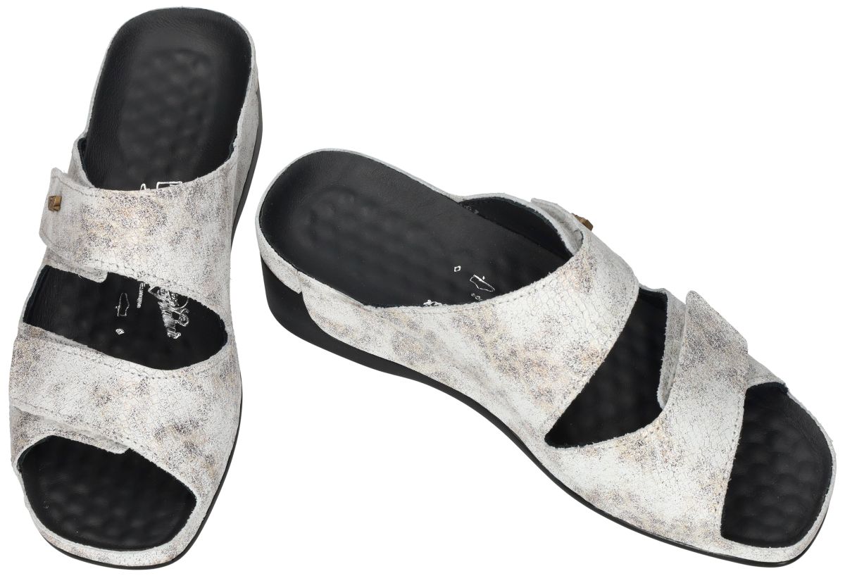 VITAL model/artikel 15601 TINA Python Creme zijn zilver/grijs met goud gevlekte en pythonprint damesschoenen comfort gezondheids sleehak slippers of muiltjes van de Oostenrijkse schoenenfabrikant en schoenenmerk VITAL antivarice-anti-spatader. Deze VITAL slippers zijn uitgevoerd in een lichtgrijs nubuck met een vlekkenprint in goud en bruin en met subtiele snakeprint en staan op een gemakkelijke stabiele sleehak 4 cm hoog en is voorzien van gemakkelijke en aanpasbare klittenbandsluiting of velcrosluiting over de wreef. VITAL relax - massage schoenen zijn gekend om hun perfecte afwerking en hun heilzame werking op de bloedsomloop in de voeten en benen. Door de gebobbelde binnenzool waardoor spataders worden voorkomen. De Vital schoenzool heeft immers een dubbele werking: Door zijn massage van de voetzool wordt de bloedcirculatie en de werking van het bloedvatenstelsel in de voetzool bevordert en ontspant zo uw benen en gaat ook spataders vorming tegen. Eveneens worden de reflex kringloop-zones onderaan de voetzool heilaam gestimuleerd die de functies van verschillende lichaamsorganen regelen. Alles samen zorgt dit voor een totale ontspanning van het hele lichaam. VITAL slippers en muiltjes schoenen vindt u in onze schoenenwinkel regio Aalst, Ninove, Geraardsbergen, Zottegem of u kan online bestellen op onze webshop.