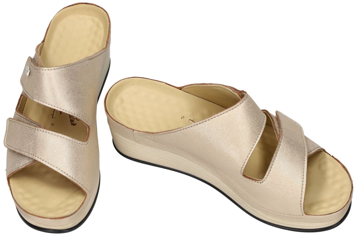 VITAL artikel/model 181339 LARA Mathilda Gold zijn goud metallic (light gold) met korreltextuur damesschoenen comfort gezondheids plateauzool slippers of muiltjes uit de nieuwe lente/zomer 2026 collectie van de Oostenrijkse schoenenfabrikant en schoenenmerk VITAL antivarice - anti-spatader. Deze modieuze, hippe VITAL slipper muiltjes zijn uitgevoerd in een sparkelend goud metallic met een korrelige print en staat op een dikke beige dennenhout-print plateau zool van 3,5 cm dik (vooraan 2,5 cm en achteraan 6 cm) en is voorzien van gemakkelijke en aanpasbare klittenbandsluiting of velcrosluiting over de wreef. VITAL relax - massage schoenen zijn gekend om hun perfecte afwerking en hun heilzame werking op de bloedsomloop in de voeten en benen. Door de gebobbelde binnenzool waardoor spataders worden voorkomen. De vital schoenzool heeft immers een dubbele werking: Door zijn massage van de voetzool wordt de bloedcirculatie en de werking van het bloedvatenstelsel in de voetzool bevordert en ontspant zo uw benen en gaat ook spatader vorming tegen. Eveneens worden de reflex kringloop-zones onderaan de voetzool gestimuleerd die de functies van verschillende lichaamsorganen regelen. Alles samen zorgt dit voor een totale ontspanning. VITAL slippers en muiltjes schoenen vindt u in onze schoenenwinkel regio Aalst, Ninove, Geraardsbergen, Zottegem, Liedekerke of u kan online bestellen op onze webshop.
