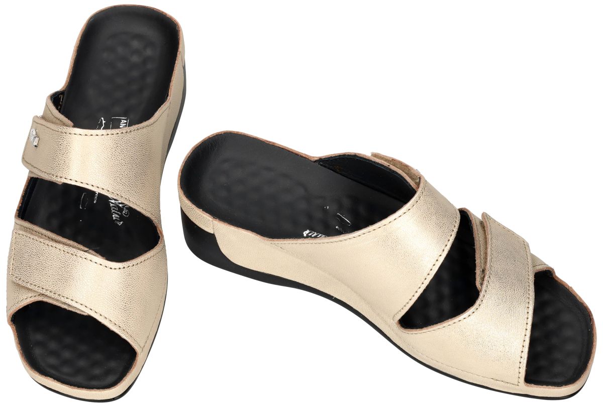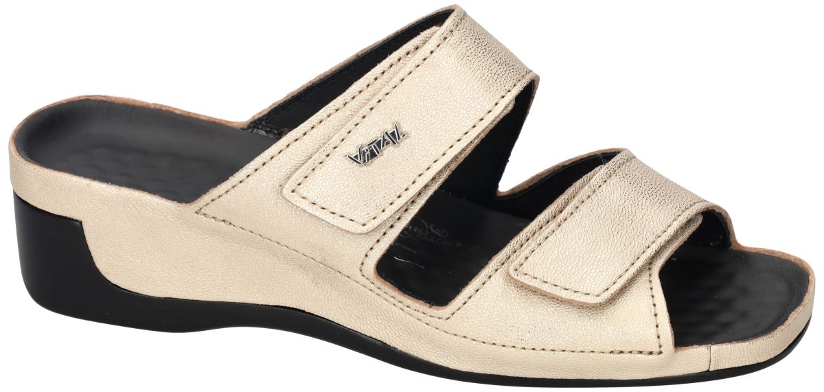 Deze Vital Tina slippers (artikel 18609) in de uitvoering Mathilda Gold combineren wellnesscomfort met een stijlvolle uitstraling. Het bovenwerk in lichtgoud metallic leder geeft deze sleehak slipper een elegante en zomerse look, perfect voor zowel binnen als buiten. Dankzij de twee verstelbare klittenbanden geniet u van een optimale en persoonlijke pasvorm. Het kenmerkende gebobbelde massagevoetbed van Vital stimuleert de reflexzones onder de voet, bevordert de bloedsomloop en helpt vermoeide voeten en zware benen te verlichten . Bovendien ondersteunt het anatomisch gevormde voetbed het lichaam en zorgt het voor een aangenaam loopgevoel. De comfortabele sleehak biedt een lichte hielverhoging en stabiele ondersteuning bij elke stap. Een ideale keuze voor dames die gezondheid, comfort en een modieuze uitstraling willen combineren. VITAL slippers en muiltjes schoenen vindt u in onze schoenenwinkel regio Aalst, Ninove, Geraardsbergen, Zottegem, Liedekerke of u kan online bestellen op onze webshop.