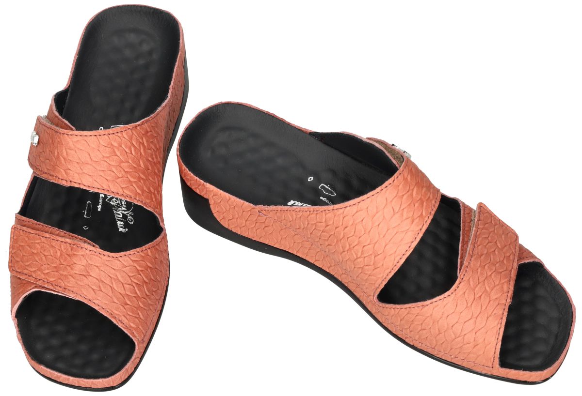 VITAL model/artikel 20603 TINA Valkiria Altrosa zijn koraal roze of oud-roze lederen met een uitgesproken vlechtwerk patroon damesschoenen comfort gezondheids sleehak slippers of muiltjes van de Oostenrijkse schoenenfabrikant en schoenenmerk VITAL antivarice-anti-spatader. Deze VITAL slippers zijn uitgevoerd in een unieke oudroze leder met een uitgesproken touw of koord vlechtwerk print (lijkt ook een beetje op gevlochten riet of rotan) en staan op een gemakkelijke stabiele sleehak 4 cm hoog en is voorzien van gemakkelijke en aanpasbare klittenbandsluiting of velcrosluiting over de wreef. VITAL relax - massage schoenen zijn gekend om hun perfecte afwerking en hun heilzame werking op de bloedsomloop in de voeten en benen. Door de gebobbelde binnenzool waardoor spataders worden voorkomen. De Vital schoenzool heeft immers een dubbele werking: Door zijn massage van de voetzool wordt de bloedcirculatie en de werking van het bloedvatenstelsel in de voetzool bevordert en ontspant zo uw benen en gaat ook spataders vorming tegen. Eveneens worden de reflex kringloop-zones onderaan de voetzool heilaam gestimuleerd die de functies van verschillende lichaamsorganen regelen. Alles samen zorgt dit voor een totale ontspanning van het hele lichaam. VITAL slippers en muiltjes schoenen vindt u in onze schoenenwinkel regio Aalst, Ninove, Geraardsbergen, Zottegem of u kan online bestellen op onze webshop.
