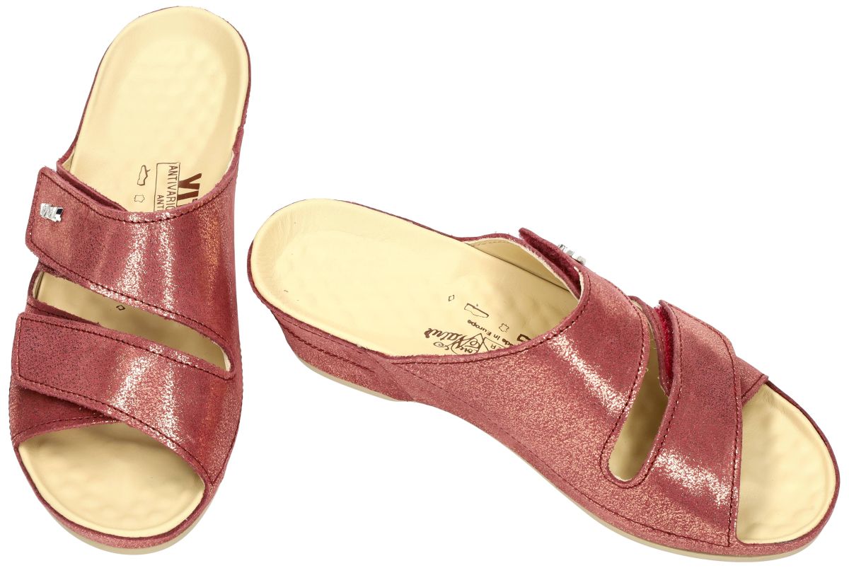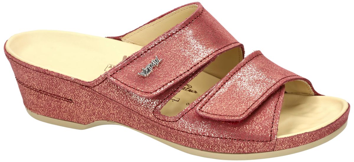VITAL artikel 19543 model EVA Creta Lachs zijn roze/goud comfort gezondheids slippers of muiltjes van het schoenenmerk VITAL anti-spatader. Deze VITAL slipper-muiltjes zijn uitgevoerd in een glinsterend roze nubuck met gouden sparkeling en staan op een comfortabele en stabiele sleehak van 4 cm en is voorzien van gemakkelijke en aanpasbare klittenbandsluiting of velcrosluiting over de wreef. VITAL relax - massage schoenen zijn gekend om hun perfecte afwerking en hun heilzame werking op de bloedsomloop in de voeten en benen door de gebobbelde binnenzool waardoor spataders worden voorkomen. De Vital schoenzool heeft immers een dubbele werking: Door zijn massage van de voetzool wordt de bloedcirculatie en de werking van het bloedvatenstelsel in de voetzool bevordert en ontspant zo uw benen en gaat ook spataders vorming tegen. Eveneens worden de reflex kringloop-zones onderaan de voetzool heilaam gestimuleerd die de functies van verschillende lichaamsorganen regelen. Alles samen zorgt dit voor een totale ontspanning van het hele lichaam. VITAL slippers en muiltjes schoenen vindt u in onze schoenenwinkel regio Aalst, Ninove, Geraardsbergen, Zottegem, Liedekerke of u kan online bestellen op onze webshop.