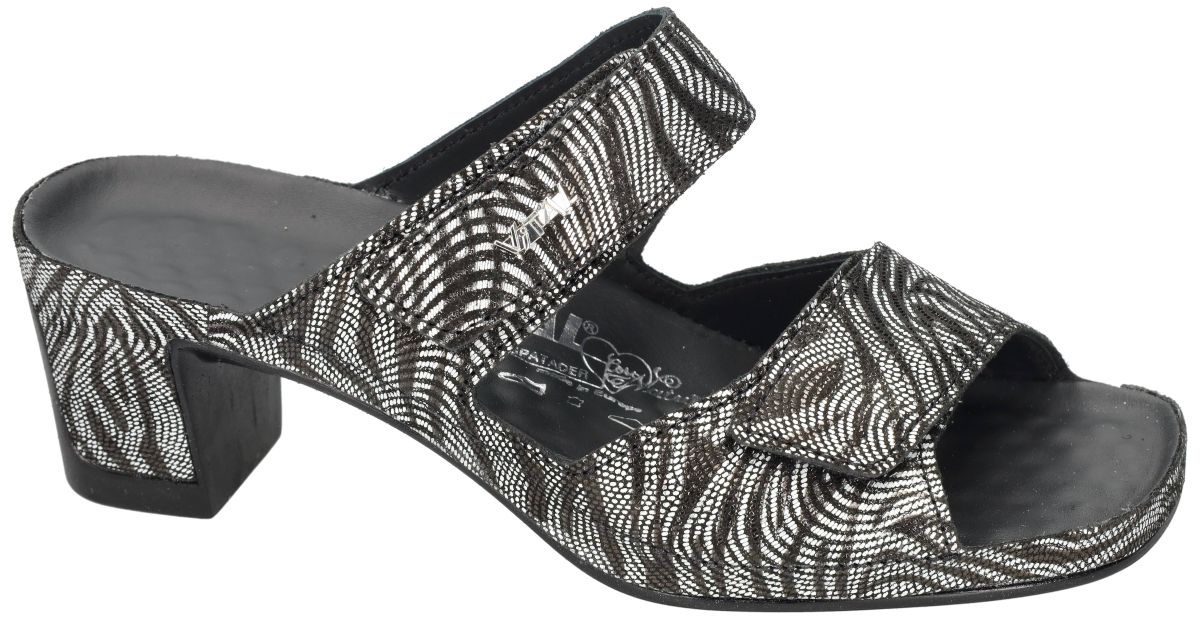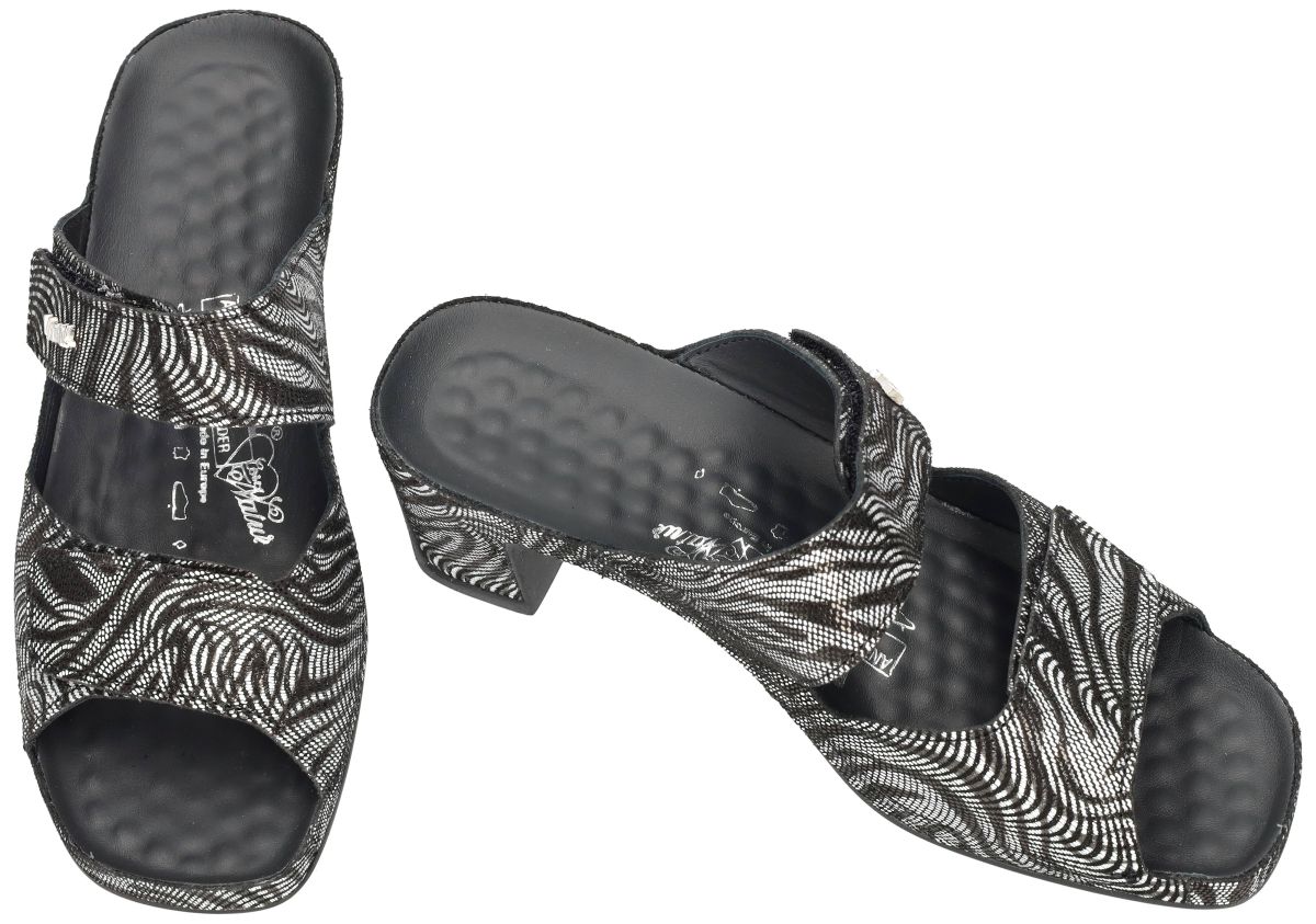 VITAL model/artikel 29900 JOY Zebra Schwarz zijn zwart/zilver zebra print damesschoenen comfort gezondheids blokhak slippers of muiltjes van de Oostenrijkse schoenenfabrikant en schoenenmerk VITAL antivarice-anti-spatader. Deze VITAL slippers zijn uitgevoerd in een prachtige zebra-strepen print met zwarte en zilver kleuren in fijne glinsterende stippjes en staan op een stabiele blokhak 4 cm hoog en is voorzien van gemakkelijke en aanpasbare klittenbandsluiting of velcrosluiting over de wreef. VITAL relax - massage schoenen zijn gekend om hun perfecte afwerking en hun heilzame werking op de bloedsomloop in de voeten en benen. Door de gebobbelde binnenzool waardoor spataders worden voorkomen. De Vital schoenzool heeft immers een dubbele werking: Door zijn massage van de voetzool wordt de bloedcirculatie en de werking van het bloedvatenstelsel in de voetzool bevordert en ontspant zo uw benen en gaat ook spataders vorming tegen. Eveneens worden de reflex kringloop-zones onderaan de voetzool heilaam gestimuleerd die de functies van verschillende lichaamsorganen regelen. Alles samen zorgt dit voor een totale ontspanning van het hele lichaam. VITAL slippers en muiltjes schoenen vindt u in onze schoenenwinkel regio Aalst, Ninove, Geraardsbergen, Zottegem, Liedekerke of u kan online bestellen op onze webshop.