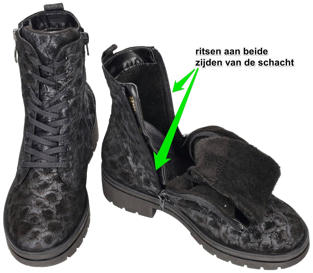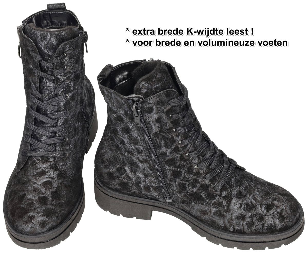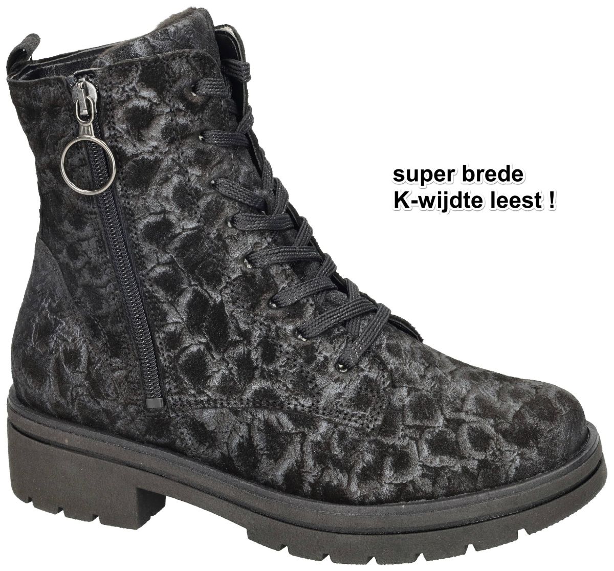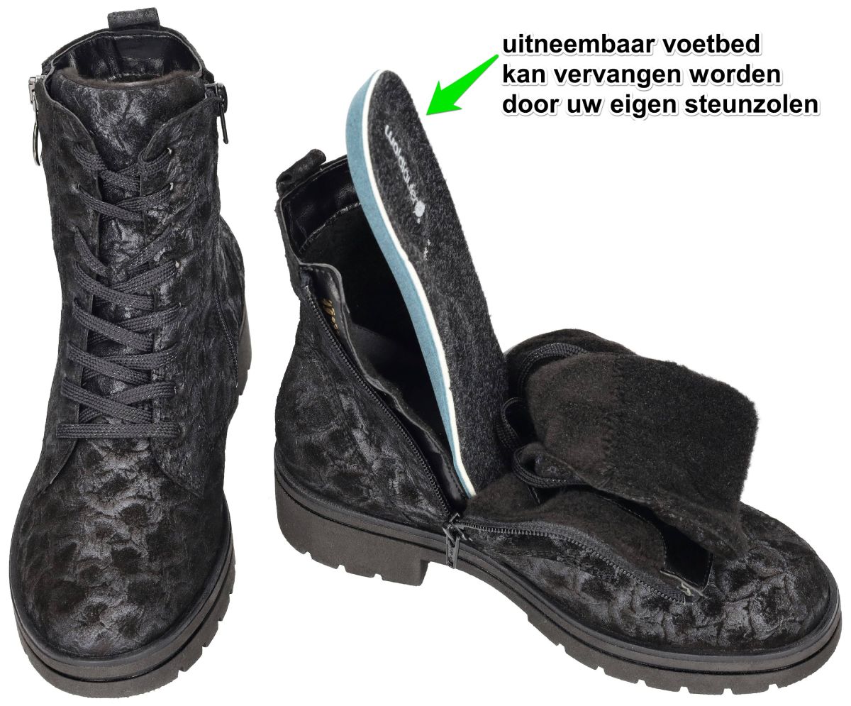 Waldläufer dames veterboots K-Zoe – artikel 648803 Cany Schwarz. Deze extra brede veterboots van Waldläufer combineren maximale ruimte met stijlvolle elegantie. Ontworpen in een super brede K-wijdte leest, zijn ze ideaal voor dames met zeer brede, volumineuze of gezwollen voeten die nood hebben aan extra comfort zonder in te boeten aan uitstraling. De upper in de uitvoering Cany Schwarz is vervaardigd uit een hoogwaardig zwart materiaal met unieke fluweelachtige glans en subtiele struisvogelprint, wat deze boots een moderne, luxueuze uitstraling geeft. Het bijzondere oppervlak weerspiegelt het licht op een zachte manier en voelt aangenaam aan. Praktisch gemak staat centraal: de ritsen aan beide zijden van de schacht maken het aantrekken bijzonder eenvoudig, zelfs bij hogere wreef of brede enkel. Binnenin zorgt het uitneembaar voetbed voor optimaal draagcomfort en kan dit moeiteloos worden vervangen door uw eigen steunzolen. De lichte, maar stevige lucht-gepolsterde zool biedt uitstekende schokdemping en ondersteuning bij elke stap. Dankzij het diepe anti-slip profiel geniet u van extra grip en stabiliteit, ook op natte of gladde ondergronden. Met de Waldläufer K-Zoe Cany Schwarz kiest u voor een perfecte balans tussen comfort, functionaliteit en eigentijdse elegantie – een ideale winterboot voor elke vrouw die waarde hecht aan pasvorm én stijl. Waldlaufer schoenen, boots, laarzen kan men aanschaffen in onze schoenenwinkel regio Aalst, Ninove, Geraardsbergen, Zottegem, Liedekerke of online bestellen op onze webshop.