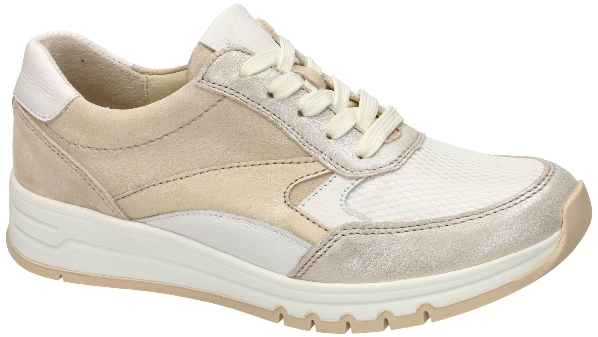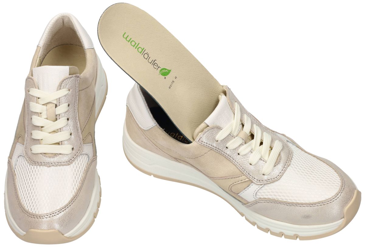 Ontdek deze Waldläufer dames sneaker H-April 957003 uit de nieuwste lente/zomer collectie, uitgevoerd in de stijlvolle kleurcombinatie beige/weiss/lightgold. Deze sportieve veterschoen tilt comfort en elegantie naar een hoger niveau en past perfect bij zowel casual outfits als een verfijnde vrijetijdsstijl. Het bovenwerk bestaat uit een harmonieuze mix van lamsnappa, nappaleer, nubuck en suède, aangevuld met een subtiel glinsterende lightgold metallic touch en een moderne mesh inzet op de wreef voor extra ventilatie. Binnenin wordt u verwend met een premium leren binnenvoering, die niet alleen ademend werkt maar ook voor een zacht, aangenaam voetklimaat zorgt. Een van de belangrijkste troeven is de Microlight luchtpolsterzool, die elke stap veerkrachtig opvangt en een licht, schokdempend loopgevoel biedt. De praktische vetersluiting verzekert een perfecte aanpassing aan de voet, terwijl de Comfort Fit H-wijdte extra ruimte biedt — ideaal voor wie een ietwat breder voeten heeft en ontspannen pasvorm wenst. Het uitneembare voetbed maakt deze sneaker bijzonder geschikt voor dragers van orthopedische steunzolen of persoonlijke inlays. De zachte beigetinten, crèmekleurige veters, de glansaccenten op de neus en het hielstuk én de contrasterende witte zool geven deze schoen een frisse, vrouwelijke uitstraling die zich moeiteloos laat combineren. Kortom, deze Waldläufer H-April sneaker combineert premium materialen, ademend leer aan de binnenzijde, luchtige mesh details en ergonomisch comfort — een ideale keuze voor wie een stijlvolle én comfortabele allrounder zoekt voor dagelijks gebruik. Waldlaufer schoenen kan men kopen in onze schoenenwinkel regio Aalst, Ninove, Geraardsbergen, Zottegem, Liedekerke of online bestellen op onze webshop.