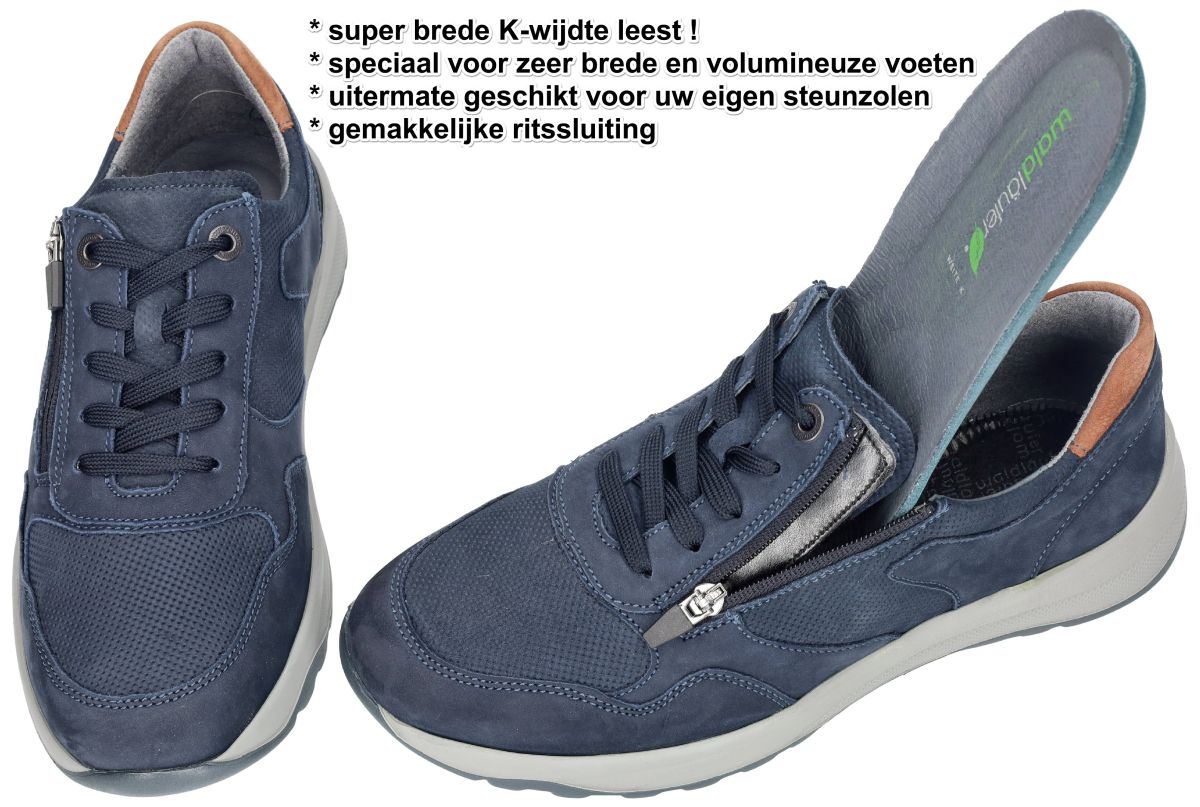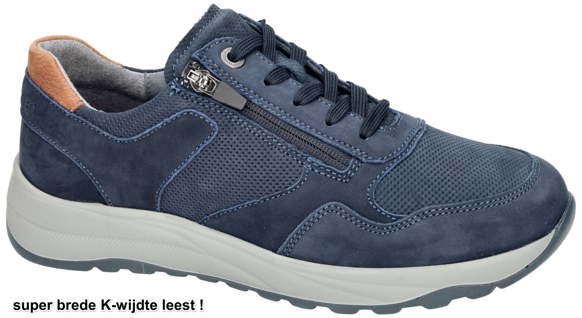 Deze sportieve heren sneaker met super brede K-wijdte van Waldläufer bewijst dat comfort en stijl perfect kunnen samengaan. Model K-John met artikelnummer 662001 in de uitvoering marine-cognac is speciaal ontwikkeld voor mannen met zeer brede, volumineuze of gezwollen voeten. Waar andere schoenen knellen of simpelweg niet passen, biedt deze K-John wél de nodige ruimte – zonder in te boeten aan ondersteuning of uitstraling. De sneaker is uitgevoerd in hoogwaardig marineblauw nubuck, gecombineerd met een stijlvol cognackleurig detail aan de hiel, wat zorgt voor een sportieve maar verzorgde look. De super brede K-wijdte leest geeft uitzonderlijk veel plaats aan de voorvoet en wreef, ideaal voor wie al lang op zoek is naar een écht comfortabele oplossing. Binnenin is deze Waldläufer voorzien van een zacht, uitneembaar voetbed dat moeiteloos kan worden vervangen door eigen steunzolen. De kalfslederen binnenbekleding voelt soepel aan, is ademend en verhoogt het draagcomfort aanzienlijk. Dankzij de combinatie van rits en vetersluiting is de schoen makkelijk aan te trekken, terwijl de veters instaan voor een optimale afstelling. De lichtgewicht maar uiterst stabiele zool is schokabsorberend en ontworpen om ook meer lichaamsgewicht probleemloos te torsen, wat deze sneaker bijzonder geschikt maakt voor dagelijks intensief gebruik. De royale polstering rond de enkel verhoogt het comfort en voorkomt drukpunten. Een betrouwbare en doordachte comfortschoen voor mannen die niet langer willen wanhopen bij het passen van schoenen. Met deze Waldläufer K-John past de voet eindelijk zoals het hoort. Waldläufer herenschoenen kan men kopen in onze schoenenwinkel regio Aalst-Ninove-Geraardsbergen-Zottegem of online bestellen op onze webshop.