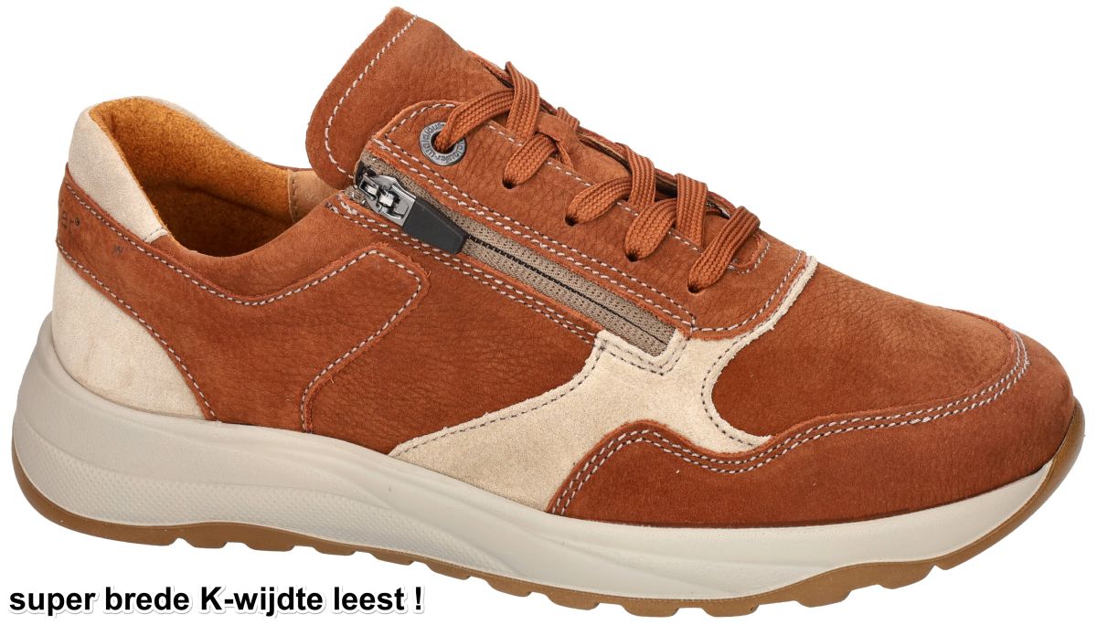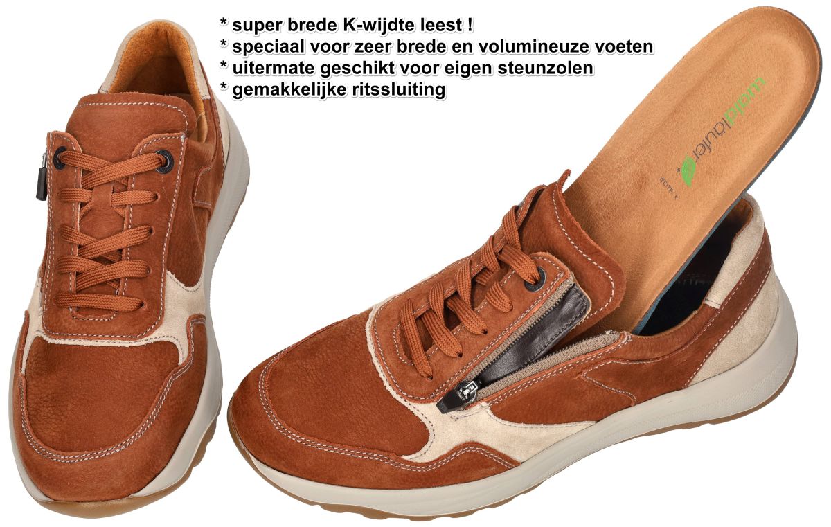 Deze sportieve heren sneaker met super brede K-wijdte van Waldläufer bewijst dat comfort en stijl perfect kunnen samengaan. Model K-John met artikelnummer 662001 in de uitvoering cognac storm is speciaal ontwikkeld voor mannen met zeer brede, volumineuze of gezwollen voeten. Waar andere schoenen knellen of simpelweg niet passen, biedt deze K-John wél de nodige ruimte – zonder in te boeten aan ondersteuning of uitstraling. De sneaker is uitgevoerd in hoogwaardig cognac bruin nubuck, gecombineerd met een stijlvol zandkleurig detail aan de hiel, wat zorgt voor een sportieve maar verzorgde look. De super brede K-wijdte leest geeft uitzonderlijk veel plaats aan de voorvoet en wreef, ideaal voor wie al lang op zoek is naar een écht comfortabele oplossing. Binnenin is deze Waldläufer voorzien van een zacht, uitneembaar voetbed dat moeiteloos kan worden vervangen door eigen steunzolen. De kalfslederen binnenbekleding voelt soepel aan, is ademend en verhoogt het draagcomfort aanzienlijk. Dankzij de combinatie van rits en vetersluiting is de schoen makkelijk aan te trekken, terwijl de veters instaan voor een optimale afstelling. De lichtgewicht maar uiterst stabiele zool is schokabsorberend en ontworpen om ook meer lichaamsgewicht probleemloos te torsen, wat deze sneaker bijzonder geschikt maakt voor dagelijks intensief gebruik. De royale polstering rond de enkel verhoogt het comfort en voorkomt drukpunten. Een betrouwbare en doordachte comfortschoen voor mannen die niet langer willen wanhopen bij het passen van schoenen. Met deze Waldläufer K-John past de voet eindelijk zoals het hoort. Waldläufer herenschoenen vindt men in onze schoenenwinkel regio Aalst-Ninove-Geraardsbergen-Zottegem, Liedekerke of kan men online bestellen op onze webshop.