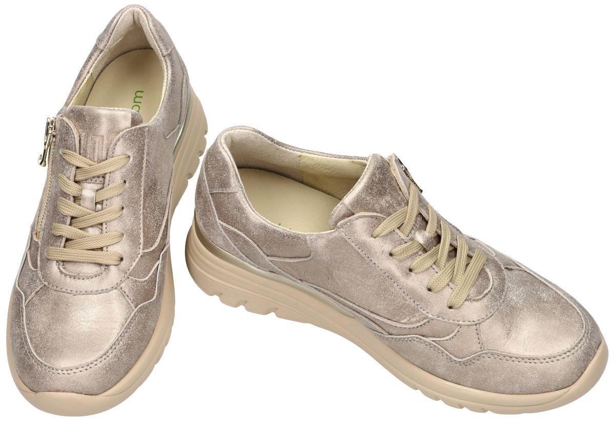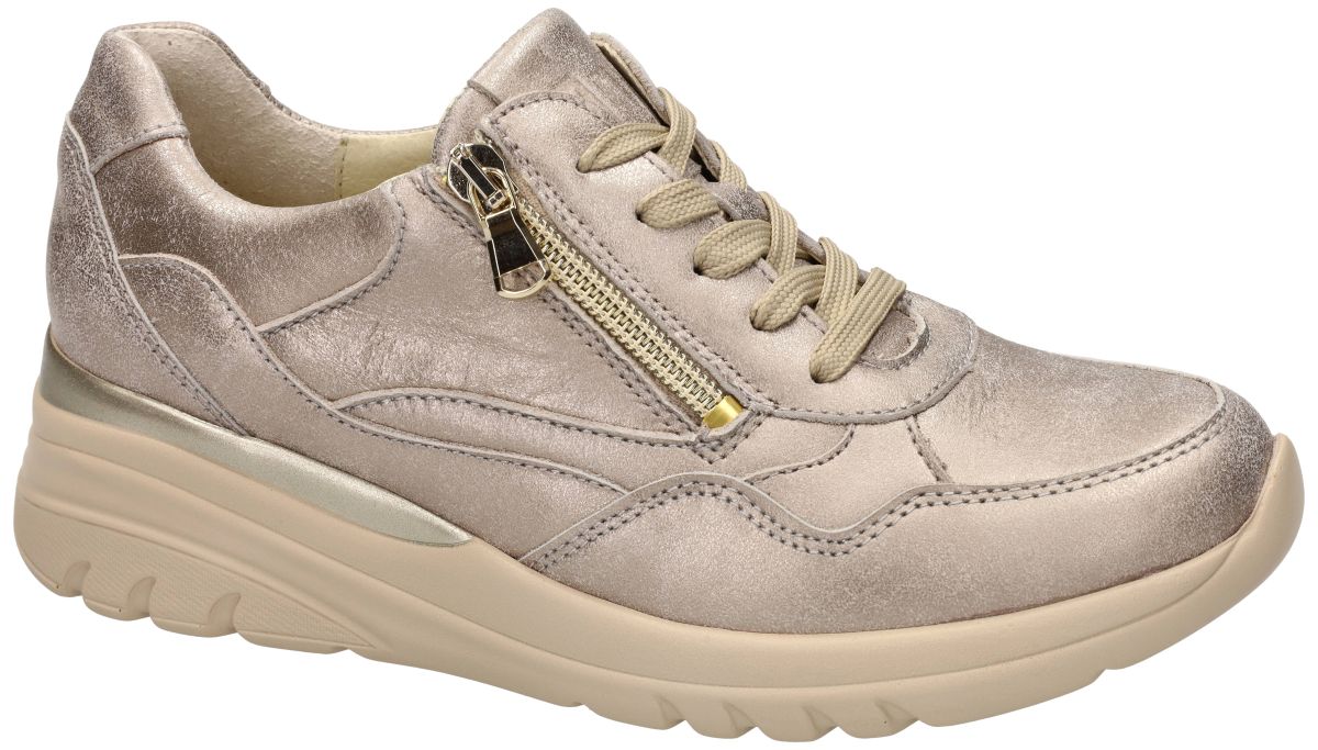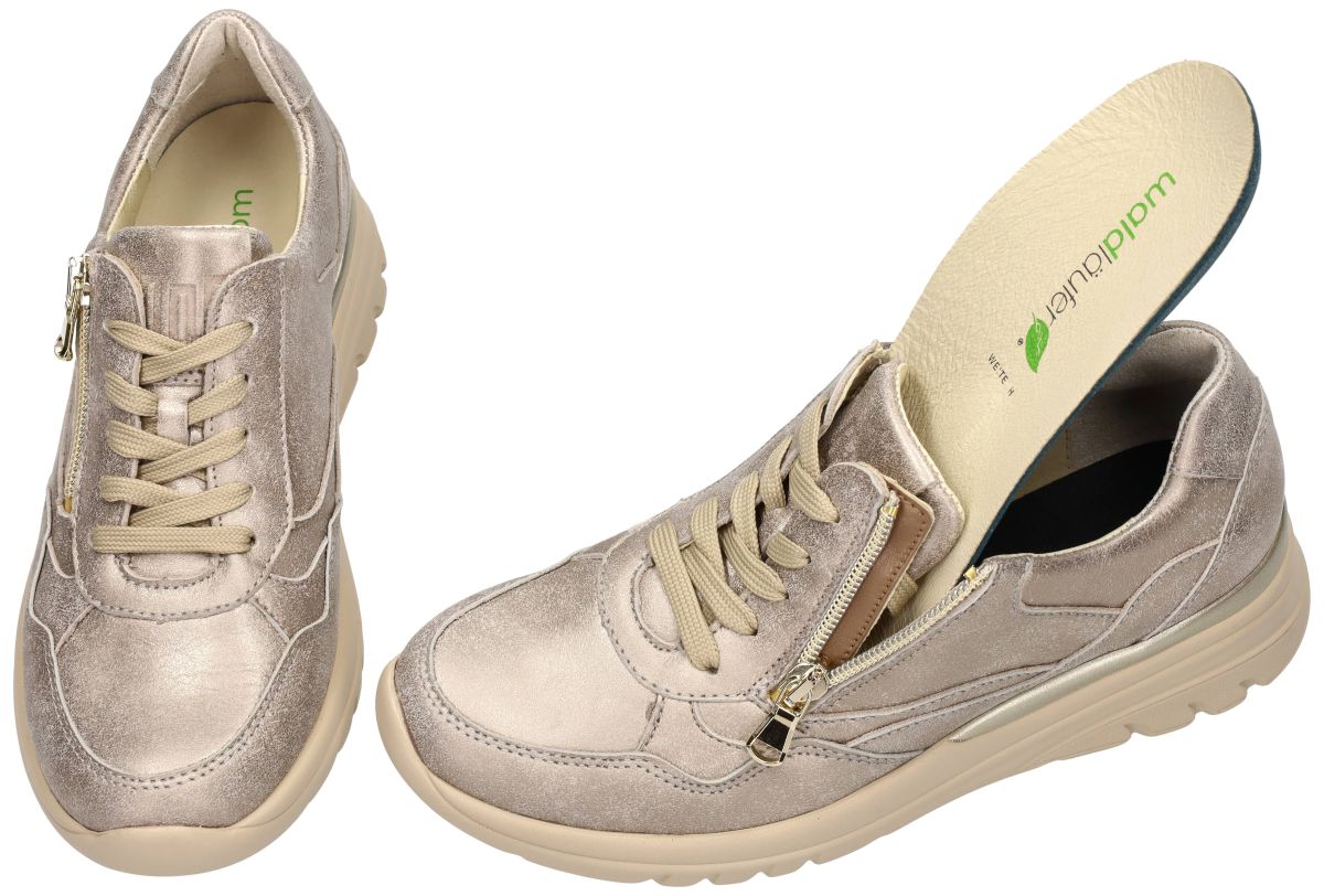 Ontdek de Waldläufer H-Carla 927003 dames sneaker uit de nieuwste lente/zomer collectie, uitgevoerd in de elegante kleur Eclis Stein. Deze veelzijdige comfort-sneaker brengt een subtiel vleugje glans en tijdloze verfijning in elke outfit. Het bovenwerk bestaat uit hoogwaardig soepel leer met een fijn gecraqueleerde metallic laag, wat de schoen een moderne en luxueuze uitstraling geeft. De lichte "oud goud" look met de ton-sur-ton veters en sierlijke stiklijnen zorgen voor een vrouwelijke en harmonieuze look. Binnenin verwent een premium leren binnenvoering de voet met ademend comfort en een aangenaam klimaat. Dankzij de vetersluiting kan de schoen perfect worden aangepast aan de voetvorm, terwijl de praktische messing-koper zijrits het aan- en uittrekken moeiteloos maakt. De PU-loopzool met luchtkussen biedt uitstekende demping en stabiliteit bij elke stap. Bovendien tilt de modieuze chunky wedge-zool de hiel subtiel met circa 3 cm op, voor extra ondersteuning, een licht lengte-effect en een trendy silhouet. Het uitneembare voetbed kan probleemloos worden vervangen door orthopedische of persoonlijke steunzolen. De ruime H-wijdte maakt deze sneaker ideaal voor iets bredere voeten of wie graag wat extra ruimte wenst. Kortom, de Waldläufer H-Carla sneaker combineert moderne metallic accenten, een luxueus lederen binnenwerk, praktische rits, trendy verhogende zool en uitzonderlijk loopcomfort — een perfecte keuze voor wie stijl, gemak en ondersteuning in één schoen zoekt voor dagelijks gebruik. Waldlaufer schoenen kan men kopen in onze schoenenwinkel regio Aalst, Ninove, Geraardsbergen, Zottegem, Liedekerke of online bestellen op onze webshop.