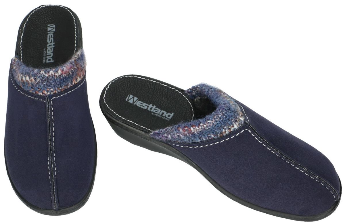 WESTLAND (voorheen ROMIKA) artikel/model 29308 AVIGNON 308 dunkelblau zijn donkerblauwe velour damesschoenen pantoffels, sloffen, muiltjes of clogs van het Duitse schoenenmerk Josef Seibel. Deze donker blauwe Westland Avignon 308 staat op een duurzame polyurethaan anti-slip loopzool met hakhoogte 3 cm en heeft een normaal tot smalle F wijdte leest voor gemiddelde voeten. Het bovenwerk is vervaardigd uit marine blauw of inkt blauw velours met een leuke gebreide wol bovenrand en binnenin bekleed met warm microfiber fleece. Perfecte sloffen of clogs voor dagdagelijkse huiselijke bezigheden en dit aan zeer democratische prijs. U kan deze praktische Westland of Romika damespantoffel muiltjes kopen in onze schoenenwinkel regio Aalst of Ninove of online bestellen op onze webshop. Is uw maat tijdelijk niet op voorraad? Bel of mail ons dan helpen we u alsnog verder.