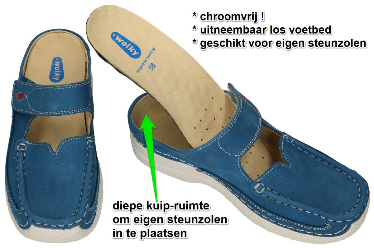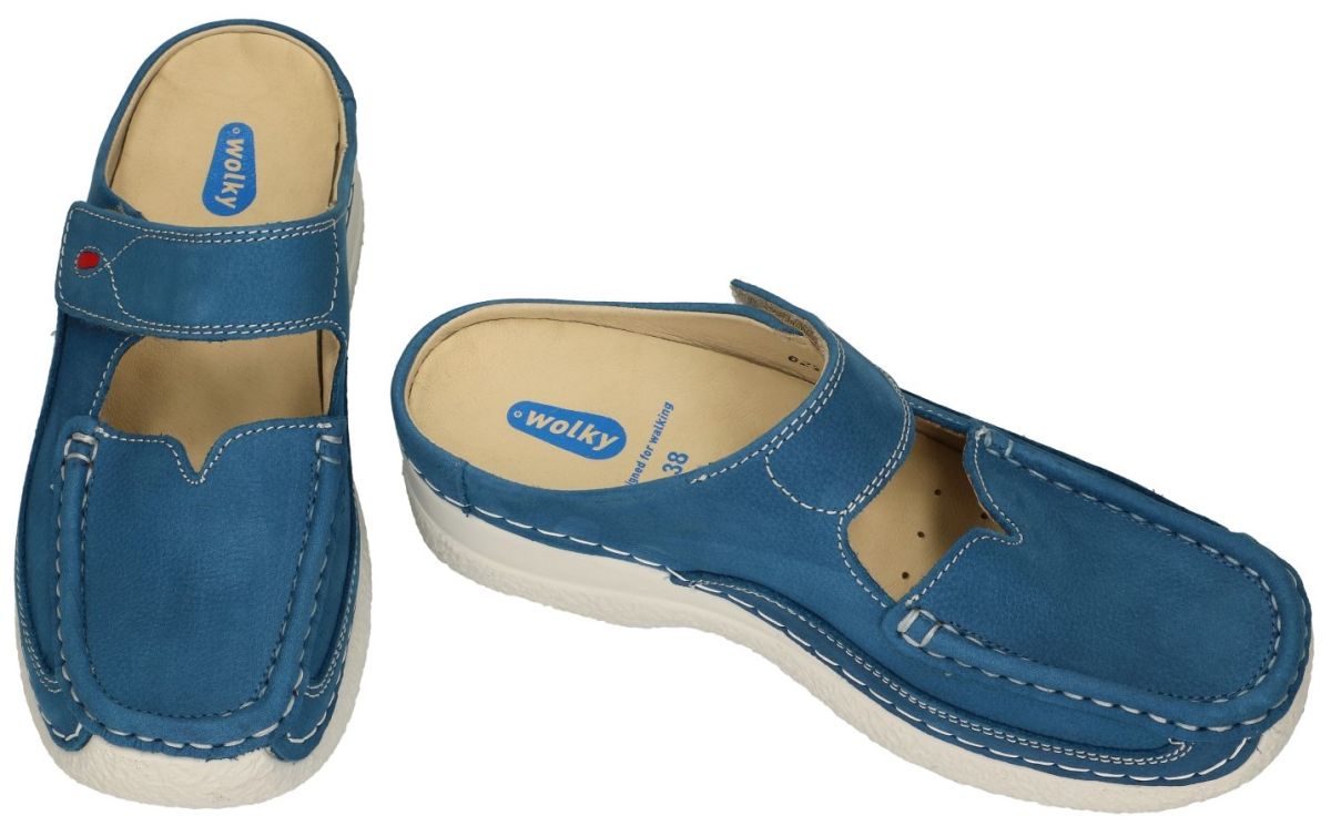 WOLKY artikel/model 0622711 ROLL SLIPPER Antique nubuck 803 Dogger blue zijn licht blauwe (jeans-blauw of denimblu) dameschoenen comfort muil of slipper schoen uit de ROLL MOC groep van de lente/zomer 2023 collectie van de Duitse schoenenfabrikant en schoenenmerk WOLKY "designed for walking". Deze super comfortabele slipper staat op een ultra (XL light) lichtgewicht en soepel veerkrachtige PU loopzool met afrolneus, het upper is vervaardigd met oker-bruin glinster nubuck leder met rechthoekige spiegelinzet vorm en een verstelbare klittenbandsluiting boven de wreef. Het binnenwerk bestaat uit 100% chroomvrij mals een aangenaam aanvoelend leder met een los anatomisch gevormd voetbed dat indien nodig kan worden vervangen door eigen steunzolen. Door de diepe kuipzool is deze slipper uitermate geschikt voor alle type steunzolen. De leest is medium tot relatief breed. Met het uniek ontwerp van deze Roll slipper uit de Roll Moc groep van Wolky loopt u op wolkjes en heeft u zelfs na een lange dag geen vermoeide voeten. Wolky schoenen kan je kopen in onze schoenenwinkel regio Aalst, Ninove, Geraardsbergen, Zottegem of kan je online bestellen op onze webshop.