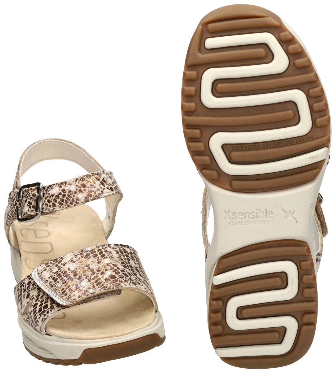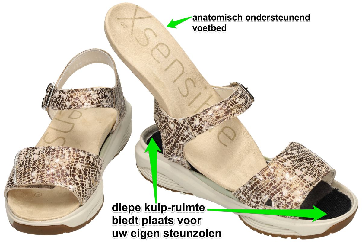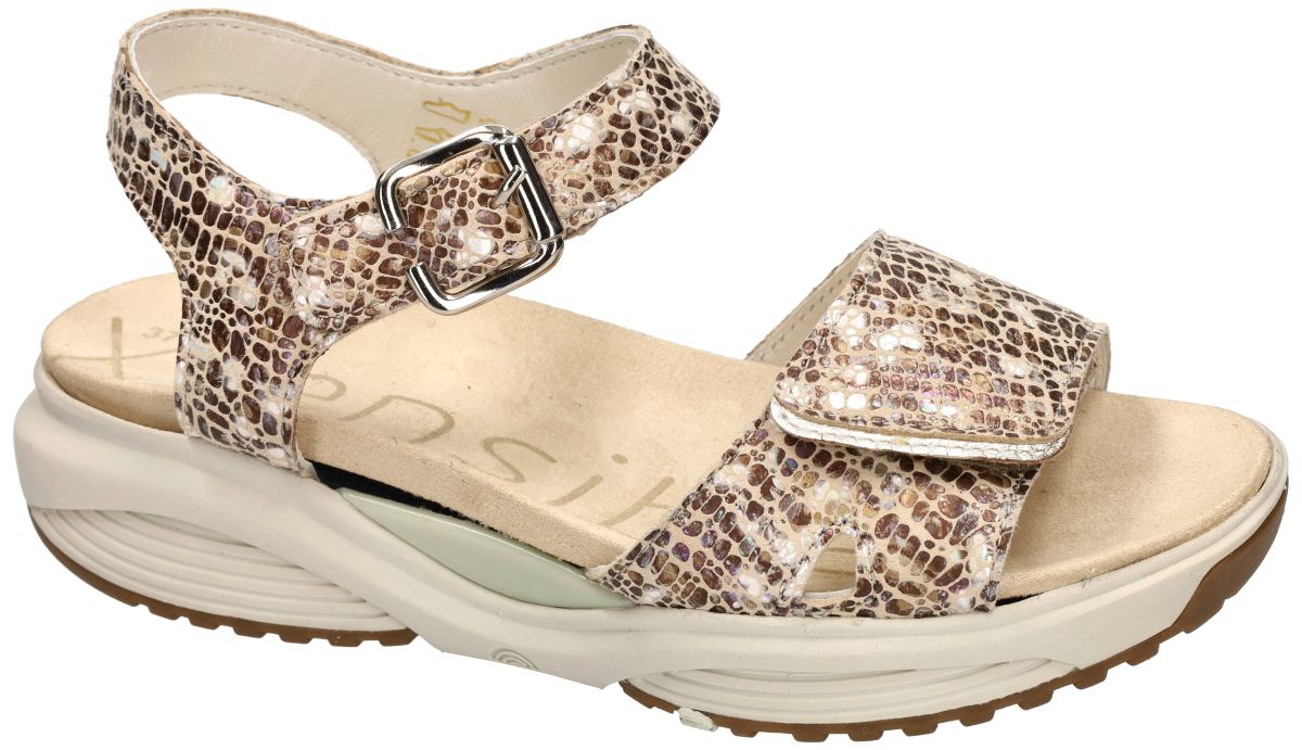 XSENSIBLE STRETCHWALKER artikel/model SKALA 30312.5.428 H Sand Combi zijn damesschoenen in bruin, brons en parelwit mozaiek-motief sandalen van Xsensible stretchwalker. Xsensible Skala is een innovatieve kwaliteitsschoen geïnspireerd op de houten balansslipper uit Japan. Deze SKALA orthopedische gezondheids sandaal uit de nieuwe lente/zomer collectie van het schoenenmerk xsensible stretchwalker is uitgevoerd in een keien-mozaiek fantasie-print met bronzen, bruine en parelmoer tinten en variaties. Kenmerkend voor de strechwalker Skala sandalen is de extra brede H-wijdte leest voor brede en zware voeten en het uniek balanspunt in het midden van de zool. Dit balanspunt zorgt voor optimale balans en een evenwichtige, gezonde lichaamshouding, ontwikkeling van de beenspieren en optimale drukverdeling over de voet en een efficiente grip bij het afrollen van de voet. Het bovenwerk is vervaardigd uit het xsensible inside strechleder met zeer grote rekbaarheid. De verbazingwekkende elasticiteit zorgt voor maximale bewegingsvrijheid en optimaal comfort. Deze Skala Xsensible strechwalker sandaal is voorzien van klittenband over de wreef en rond de enkel (de monkgesp is louter decoratief) Xsensible strechwalker schoenen kan men kopen in onze schoenenwinkel regio Aalst, Ninove, Geraardsbergen, Zottegem, Liedekerke of kan men online bestellen op onze webshop.