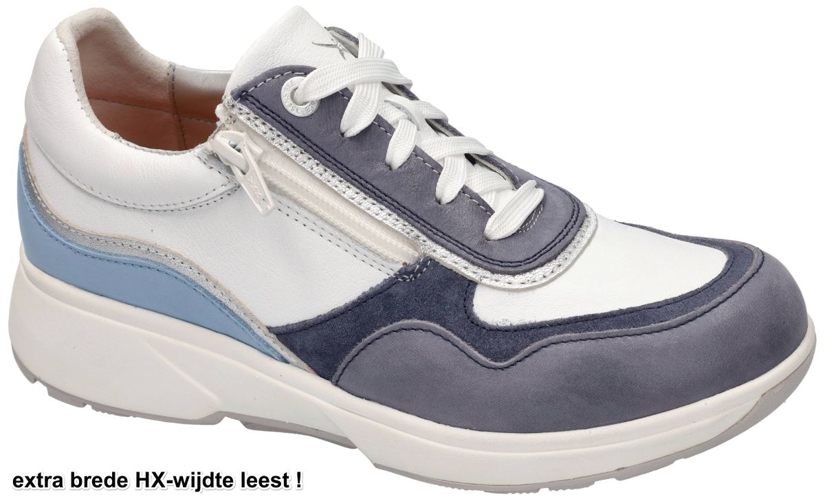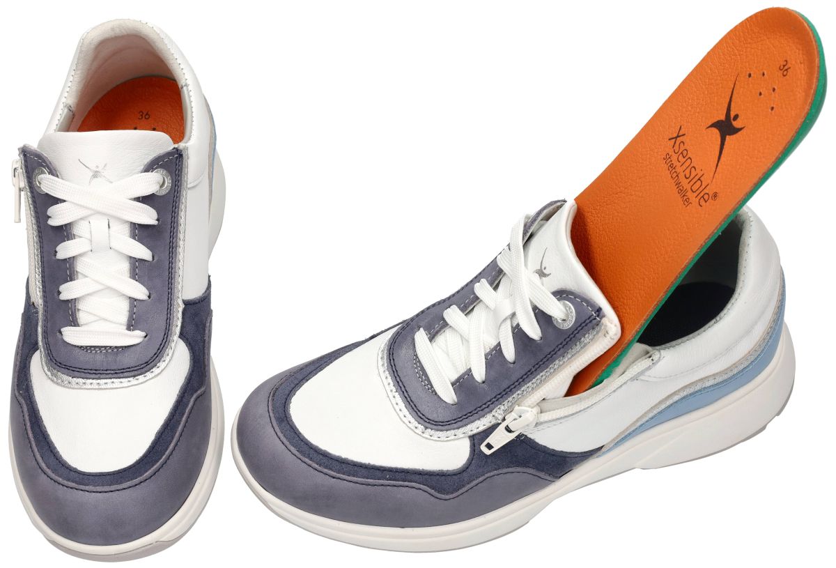 XSENSIBLE STRETCHWALKER artikel/model LIMA 30204.3.271 HX Denim Combi zijn damesschoenen wit met jeansblauw en lichtblauw gecombineerd sportieve sneakers van het schoenenmerk xsensible stretchwalker. Kenmerkend voor de strechwalker Lima sneaker is de extra brede HX-wijdte leest met voldoende ruimte voor zeer brede en zware voeten + het uniek balanspunt in het midden van de zool. Dit balanspunt zorgt voor optimale balans en een evenwichtige, gezonde lichaamshouding. Het bovenwerk is vervaardigd uit het xsensible inside strechleder met zeer grote rekbaarheid. De verbazingwekkende elasticiteit zorgt voor maximale bewegingsvrijheid en optimaal comfort. Het anatomisch orthopedisch voetbed kan indien gewenst ook vervangen worden door eigen steunzolen. Deze Lima strechwalker sneaker is voorzien van zowel veters als ritssluiting zodat aanpassen vlot en gemakkelijk gaat voor elk type voet. De Xsensible Lima HX is een damessneaker die comfort en stijl combineert, ontworpen voor vrouwen die zowel sportieve als elegante looks waarderen. Het bovenwerk is vervaardigd van hoogwaardig leer, gecombineerd met het gepatenteerde Xsensible Stretchleer. Dit stretchleer bestaat uit zes lagen en biedt maximale bewegingsvrijheid doordat het 70% in de breedte en 30% in de lengte rekt, waardoor de schoen aanvoelt als een tweede huid. De zool is uitgerust met de unieke Stretchwalker balanstechnologie, geïnspireerd op het balansprincipe van traditionele Japanse houten sandalen. Deze technologie zorgt voor optimale demping, stabiliteit en bevordert een natuurlijke en gezonde lichaamshouding, wat bijdraagt aan een betere lichaamshouding en vermindering van vermoeidheid bij langdurig dragen. De Xsensible Lima HX beschikt over een uitneembaar voetbed, vervaardigd van memory-foam, waardoor het mogelijk is om persoonlijke inlegzolen te gebruiken voor extra ondersteuning en comfort. Voorzien van zowel een veter- als ritssluiting aan de zijkant, wat zorgt voor een gemakkelijke instap en een aanpasbare pasvorm. De Lima HX is ontworpen in wijdte H, geschikt voor de bredere voet, en biedt daarmee extra ruimte en comfort. Deze combinatie van innovatieve technologieën en hoogwaardige materialen maakt de Xsensible Lima HX een ideale keuze voor vrouwen die op zoek zijn naar stijlvolle sneakers zonder concessies te doen aan comfort. Xsensible strechwalker schoenen kan men kopen in onze schoenenwinkel regio Aalst, Ninove, Geraardsbergen, Zottegem, Liedekerke of kan men online bestellen op onze webshop. Is uw maat net niet vooradig? contacteer ons en we trachten u alsnog te helpen.