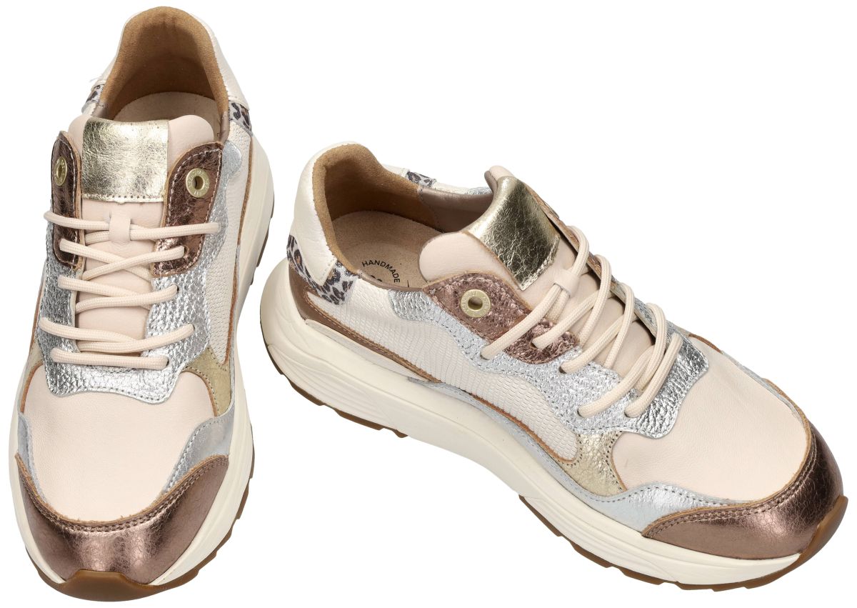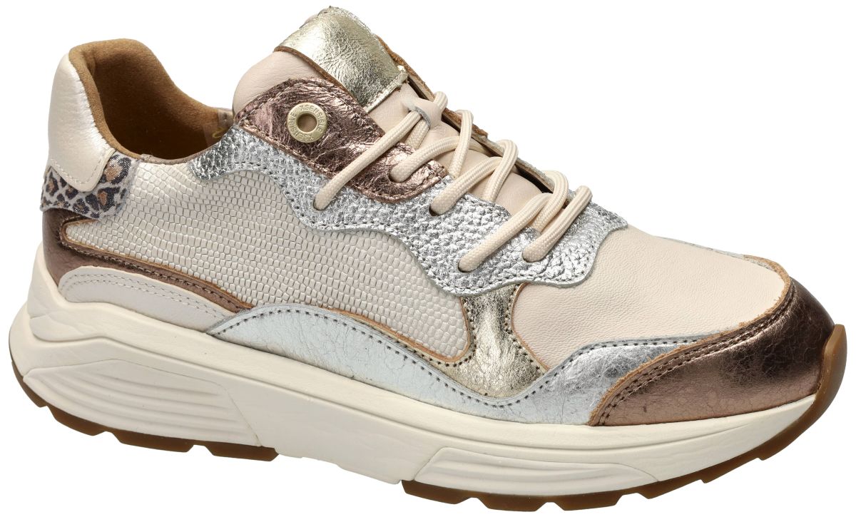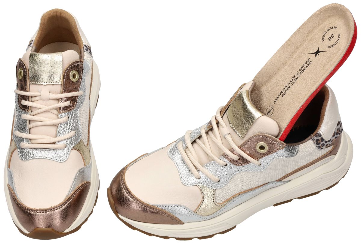Xsensible Stretchwalker Rainbow – Bronze Combi. Artikelnummer: 33011.3.396 GX Next Generation collectie. Deze Xsensible Stretchwalker Rainbow uit de nieuwe lente/zomercollectie behoort tot de geavanceerde Next Generation-serie van Xsensible en combineert een uitgesproken modieuze uitstraling met een ongeëvenaard hoog comfortniveau. In de elegante uitvoering Bronze Combi presenteert dit model zich als een luxueuze damessneaker die stijl en orthopedisch verantwoord draagcomfort moeiteloos verenigt. Ambachtelijk vakmanschap uit Europa. Elke Xsensible Stretchwalker wordt ambachtelijk met de hand vervaardigd in Europa, meer bepaald in Portugal, waar vakmanschap en kwaliteitscontrole centraal staan. Dit handwerk garandeert een nauwkeurige afwerking, duurzame materiaalkeuze en een constante pasvorm — waarden waarvoor Xsensible internationaal bekend staat. Orthopedisch verantwoorde Stretchwalker-zool : Zoals alle Stretchwalker-modellen is ook de Rainbow uitgerust met de kenmerkende balanszool, geïnspireerd op het Japanse Ippon-principe. Deze zool is uitgesproken stug, niet plooibaar en niet torsbaar, waardoor de voet optimaal wordt geleid tijdens de afwikkeling. Net deze gecontroleerde stabiliteit maakt Xsensible tot één van de meest geadviseerde schoenenmerken door orthopedisten en podologen. De zool ondersteunt een natuurlijke lichaamshouding en helpt overbelasting van voeten, enkels, knieën, heupen en onderrug te verminderen. Superieure schokabsorptie: Een belangrijk onderscheidend kenmerk van de Rainbow is de uitstekende schokabsorptie. De zool vangt schokken en trillingen bij elke stap efficiënt op, wat vooral merkbaar is bij langdurig wandelen of staan op harde ondergronden. De combinatie van stugheid én demping zorgt voor een stabiele maar uiterst comfortabele loopervaring. Deze sneaker is voorzien van een uitneembaar, anatomisch gevormd voetbed, waardoor hij perfect geschikt is voor eigen steunzolen. De comfortabele GX-wijdte biedt voldoende ruimte zonder aan elegantie in te boeten. Het bovenwerk bestaat uit hoogwaardig soepel leer, gecombineerd met subtiele stretchzones die zich aanpassen aan de voetvorm. Dit maakt de Rainbow ook geschikt voor gevoelige voeten of lichte hallux valgus. De zachte polstering rond hiel en tong voorkomt drukpunten en verhoogt het draagcomfort aanzienlijk. De uitvoering Bronze Combi valt op door haar verfijnde materiaalcombinatie. We zien een harmonieus samenspel van zacht crème wit leder in combinatie met brons, zilver en goud metallic accenten en een subtiele animal print aan de hiel. Deze details geven de sneaker een modieuze, hedendaagse uitstraling met een luxueuze toets. De sportieve off-white zool, afgewerkt met een warme rubberen loopzool, zorgt niet alleen voor visuele balans maar ook voor extra grip en stabiliteit. De Xsensible Stretchwalker Rainbow Bronze Combi is een hoogwaardige damessneaker voor wie mode, vakmanschap en orthopedisch comfort wil combineren. Dankzij de handgemaakte Europese kwaliteit, biomechanisch verantwoorde zooltechnologie en uitstekende schokdemping is dit model een betrouwbare keuze voor elke actieve dag.