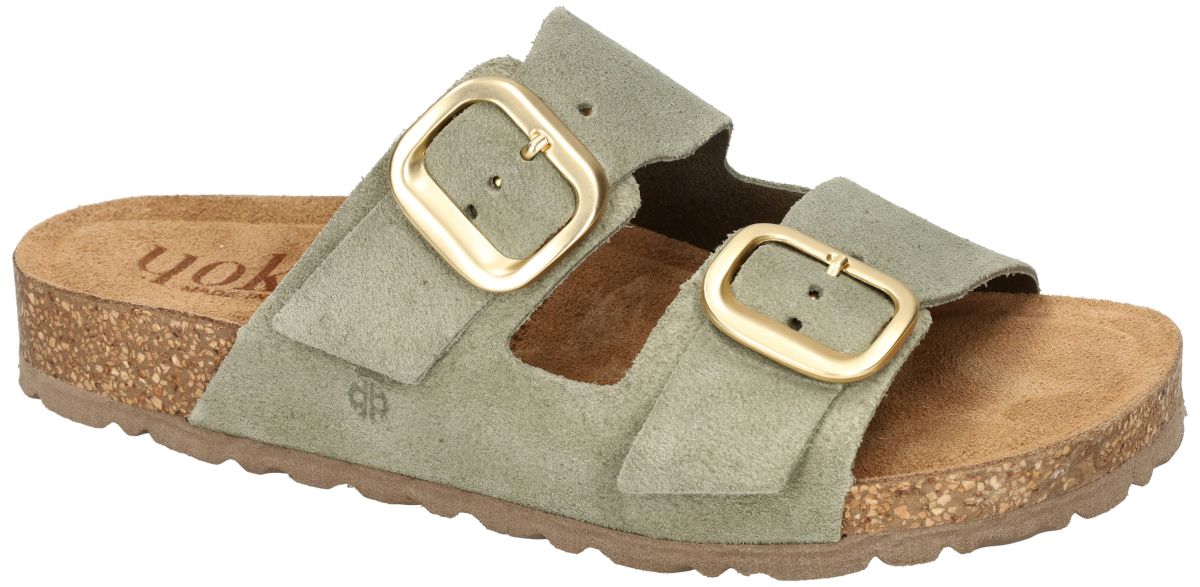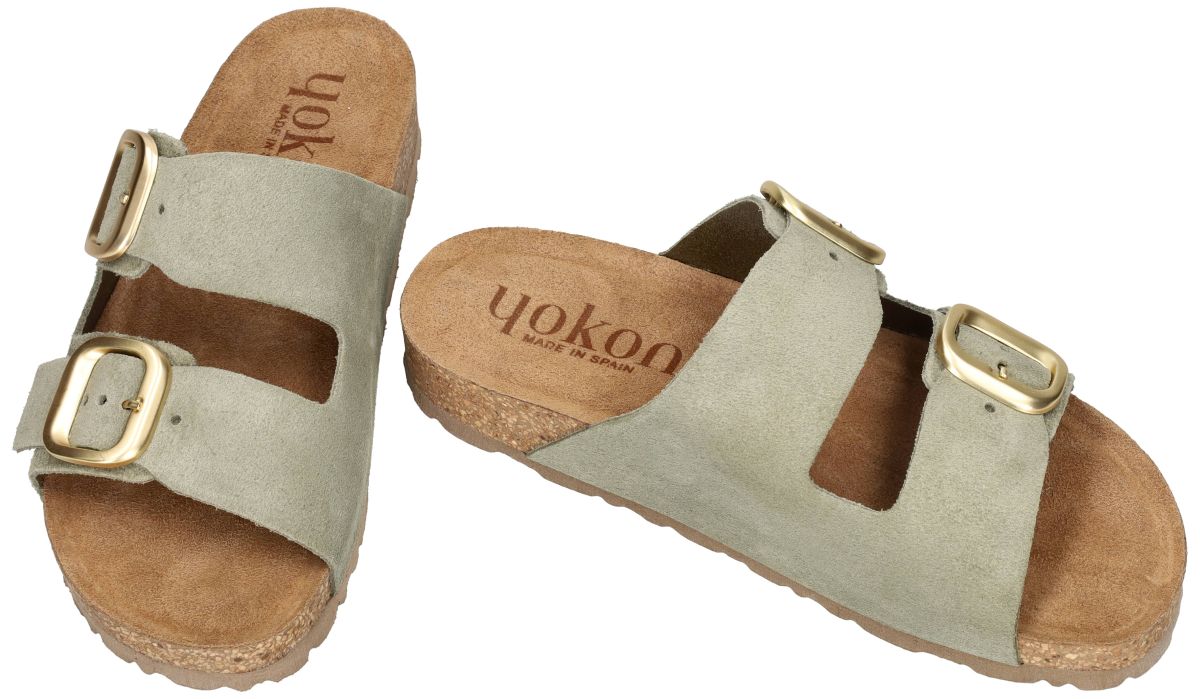 Deze bio-ecologische damesslippers van Yokono, model JERBA-700 in de uitvoering Serraje Vegie, combineren duurzaamheid met een tijdloze, natuurlijke look. Vervaardigd uit zorgvuldig geselecteerde, biologische materialen zoals rubber, kurk en leder, met chroomvrij gelooid suède bovenwerk. Er worden geen synthetische kleurstoffen of lijmen gebruikt; alles gebeurt op waterbasis, volledig in lijn met een milieubewuste productie. Het zachte, olijfgroene suède straalt rust en authenticiteit uit, terwijl de twee brede banden met grote goudkleurige gespen zorgen voor een stoere, modieuze toets en een perfecte pasvorm. Het anatomisch gevormde kurken voetbed, bekleed met leder, ondersteunt de voet op natuurlijke wijze en biedt aangenaam loopcomfort. De lichte, flexibele zool met rubberen loopvlak zorgt voor een goede grip en een ontspannen stap, ideaal voor dagelijks gebruik tijdens warme dagen. Yokono biologisch en ecologisch gefabriceerde schoenen, sandalen en slippers vindt u in onze schoenenwinkel regio Aalst, Ninove, Geraardsbergenof kan u online bestellen op onze webshop.