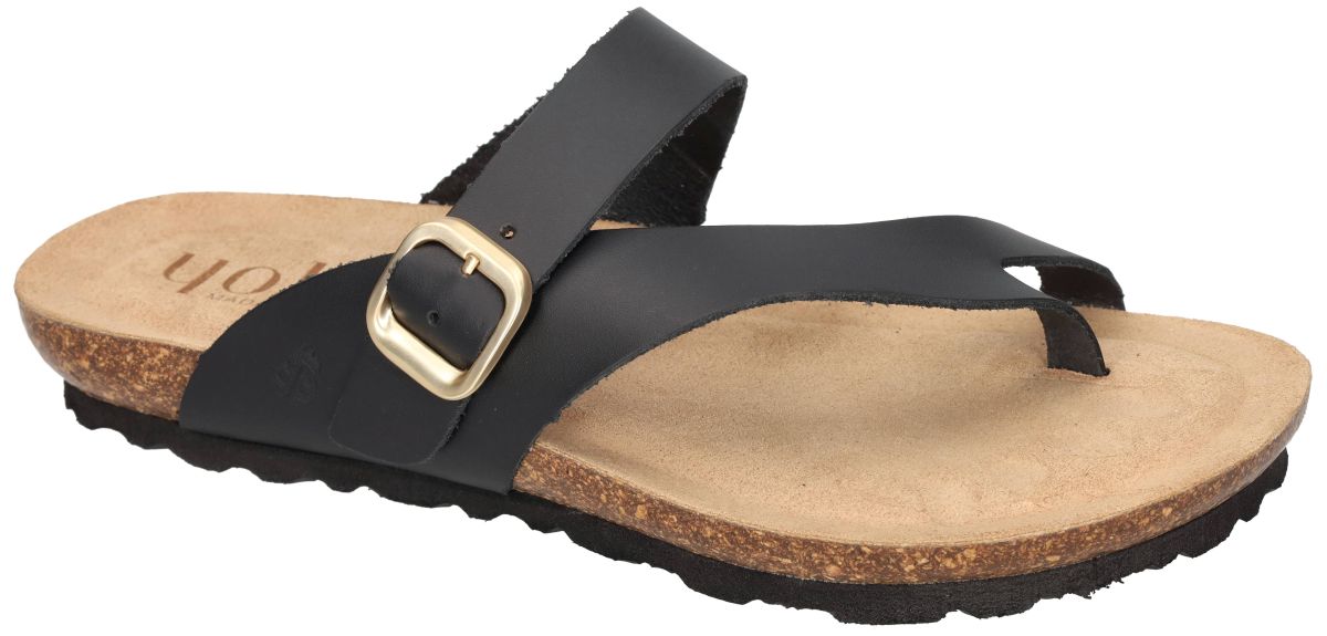 Deze natuurlijke bio teenslippers van het Spaanse schoenenmerk Yokono combineren een tijdloos zomers design met een uitgesproken ecologische productiefilosofie. Dit model SALOU-023 (sandalia plana) in de uitvoering vaquetilla negro is vervaardigd uit zwart chroomvrij gelooid rundsleder en vormt een ideale keuze voor wie comfort, authenticiteit en respect voor natuurlijke materialen belangrijk vindt. De elegante teenslipperconstructie met centrale teenband geeft de sandaal een luchtige zomerse uitstraling en laat de voet vrij ademen tijdens warme dagen. Dankzij de verstelbare wreefband met metalen gesp kan de slipper eenvoudig aan de vorm van de voet worden aangepast voor een stabiele en comfortabele pasvorm. Het comfort wordt verder versterkt door het anatomisch gevormde bio-voetbed uit natuurkurk, dat overtrokken is met zacht chroomvrij gelooid leder. Dit natuurlijke voetbed ondersteunt de voet en vormt zich geleidelijk naar de vorm van de drager. De slijtvaste zool uit natuurrubber zorgt daarbij voor flexibiliteit, grip en een aangenaam licht loopgevoel. Wat deze Yokono bio sandalen bijzonder maakt, is hun volledig ecologische en natuurlijke productieproces. De slippers worden vervaardigd uit chroomvrij gelooid leder en uitsluitend uit natuurlijke grondstoffen zoals leder, kurk en natuurrubber. Tijdens de productie worden geen synthetische kleurstoffen of chemische lijmen gebruikt; alle behandelingen gebeuren op waterbasis. Hierdoor zijn de Yokono sandalen biologisch afbreekbaar (met uitzondering van de metalen gesp). Omdat Yokono uitsluitend met natuurlijke ledersoorten werkt, kunnen er lichte kleurvariaties of kleine natuurlijke markeringen in het leder voorkomen. Deze kenmerken zijn geen defect, maar een bewijs van de authenticiteit en de kwaliteit van het gebruikte natuurlijke materiaal. Met hun zwart chroomvrij leder, natuurlijke kurkzool en milieubewuste productie zijn deze Yokono SALOU-023 bio teenslippers een uitstekende keuze voor wie een duurzame, comfortabele en ecologisch verantwoorde zomerslipper zoekt. Een eerlijke Spaanse sandaal waarin natuur, comfort en ambachtelijk vakmanschap harmonieus samenkomen. Yokono biologisch en ecologisch gefabriceerde schoenen, sandalen en slippers vindt u in onze schoenenwinkel regio Aalst, Ninove, Geraardsbergenof kan u online bestellen op onze webshop.