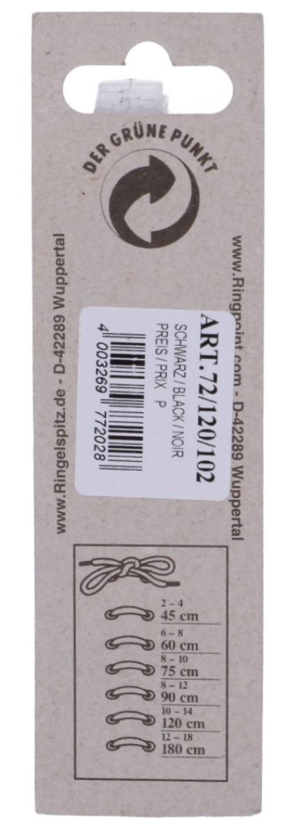 120 CM ZWART DIK ROND Ringelspitz schoenveter van het merk Ringpoint. Deze schoenveters zijn zwart dik rond en 120 cm lang voorveterschoenen met 10 tot 14 knoopsgaten.