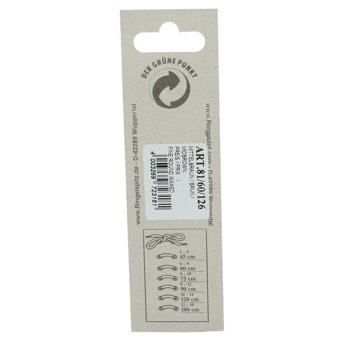 Ringelspitz Artikel .81 / 60cm / Fb.126 mittelbraun/brun/midbrown van het merk Ringpoint zijn bruine (middenbruin) Ringelspitz ronde veters van 60 cm lang voor schoenen met 3 tot 4 paar vetergaten.Deze dunne ronde gewaxte Ringpoint veters hebben een diameter van 2,5 mm. De veter is beschikbaar in verschillende lengtes en kleuren. Deze veter is zeer geschikt voor geklede schoenen. Vervang de bestaande veters of geef de schoen een totaal andere uitstraling door gebruik te maken van een andere kleur. Deze veters zijn fijn rond en in kleur bruin. Materiaal is 75% katoen en 25% polyamide.