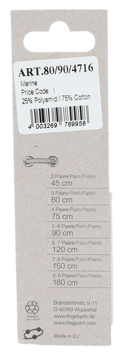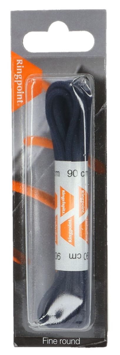 Artikel 80/90cm/Fb.4716 van het merk Ringpoint zijn marine blauwe Ringelspitz ronde fijne veters van 90 cm lang voor schoenen met 5 tot 6 paar vetergaten.Deze veters zijn fijn rond en in marine blauwe kleur. Materiaal is 25% polyamid en 75% katoen.